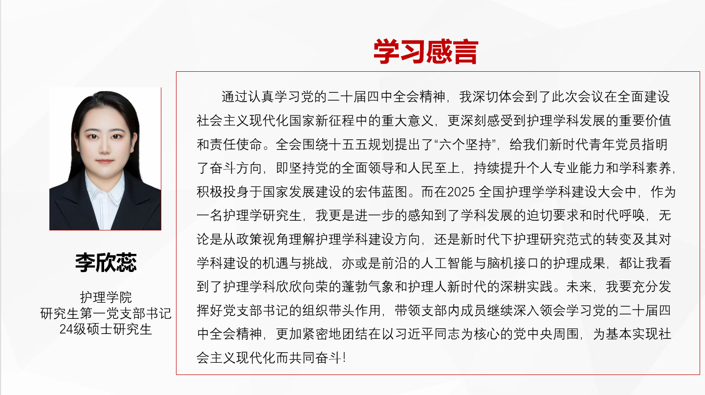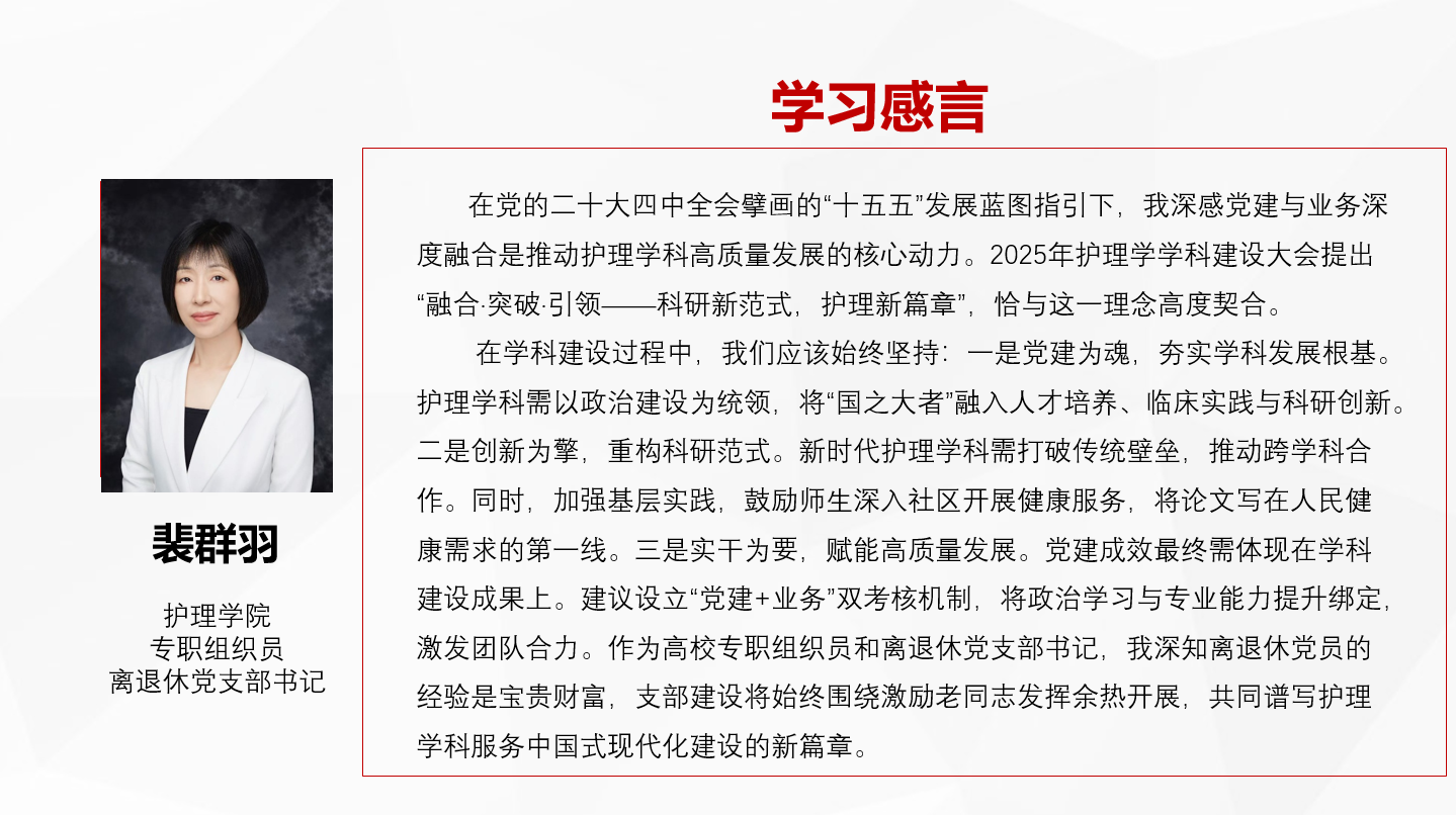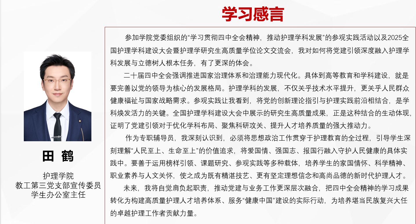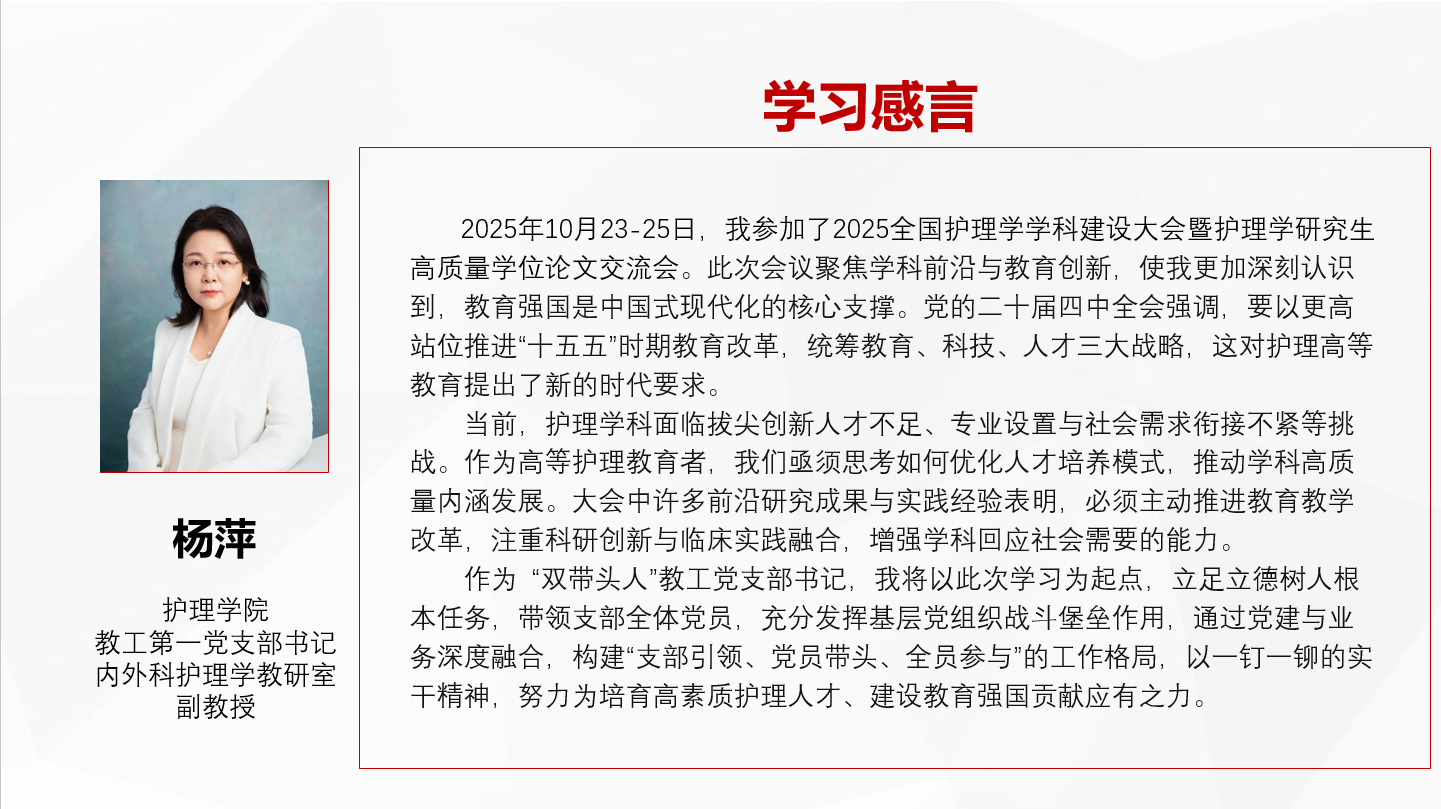 在党的二十届四中全会精神指引下,护理学院坚持以党建为引领,切实提高政治站位,勇于担当、主动作为,认真抓好贯彻落实,促进护理学科高质量发展。10月23-25日,学院党委组织党委委员、支部书记、支部委员、学办主任、团委书记等在集体学习中国共产党第二十届中央委员会第四次全体会议公报的基础上,共同参加 “2025全国护理学学科建设大会”,紧扣“融合·突破·引领——科研新范式,护理新篇章”主题,加强深入学习和交流,进一步推动党建与业务深度融合,为护理学科高质量发展注入强劲动力。