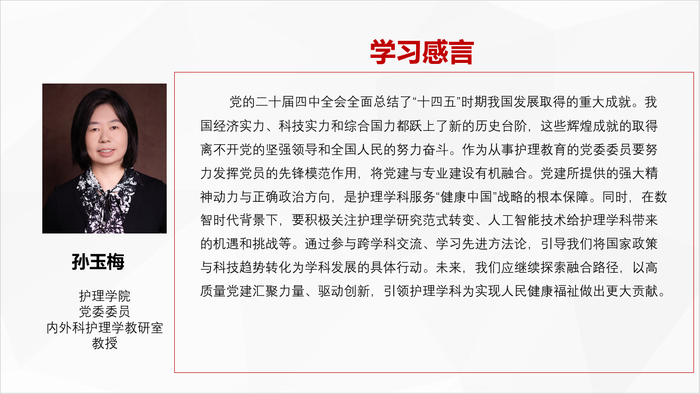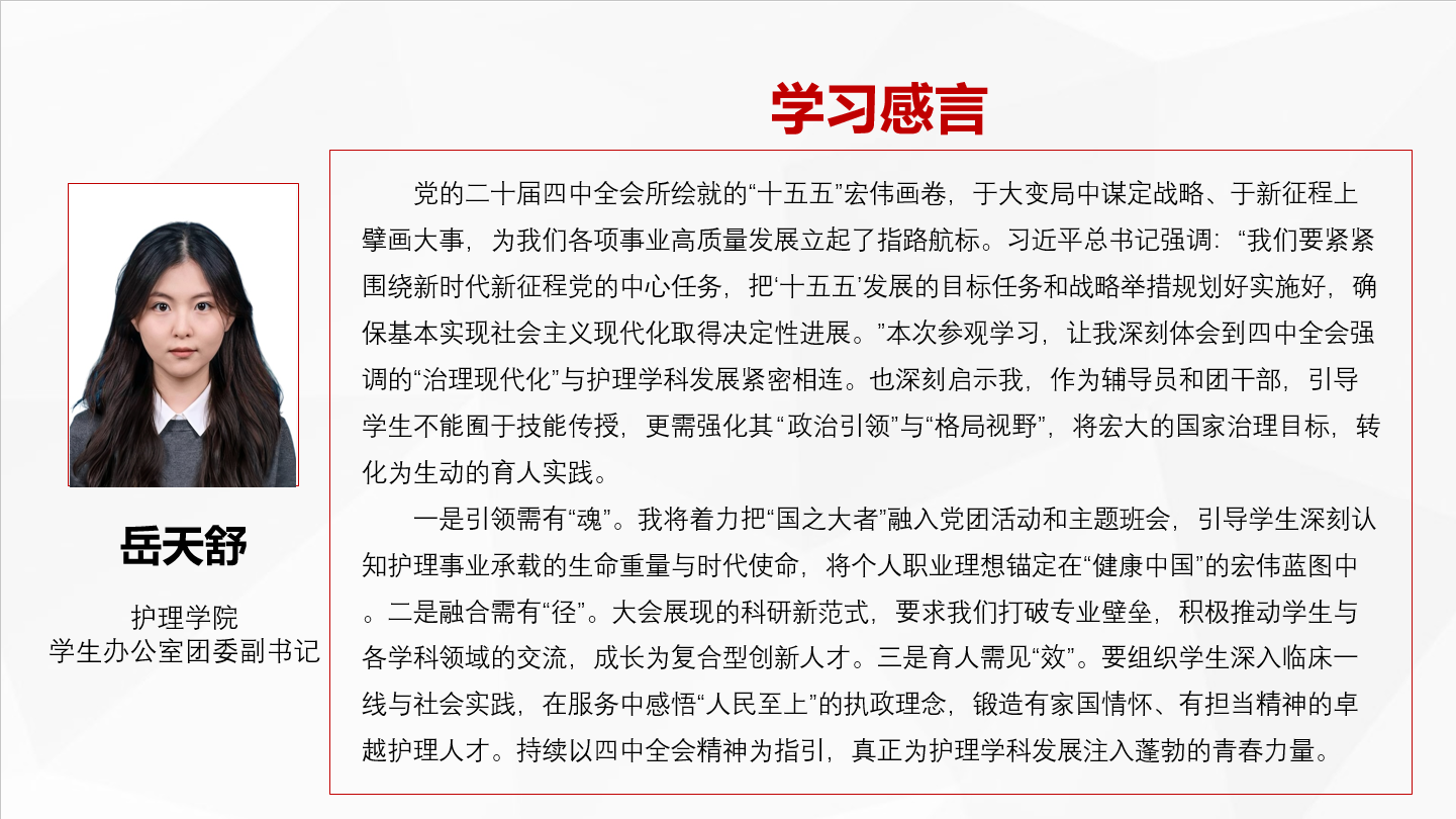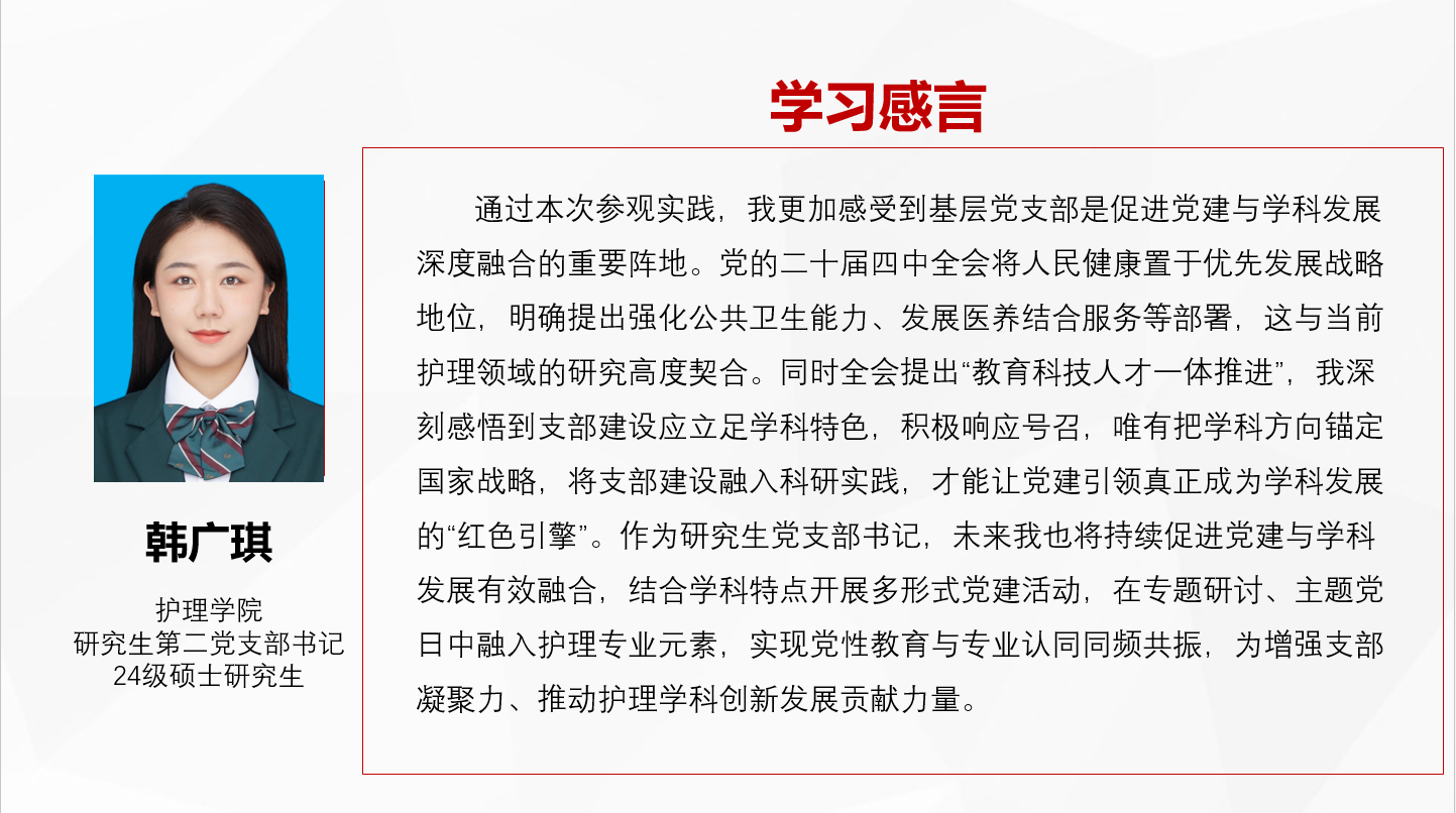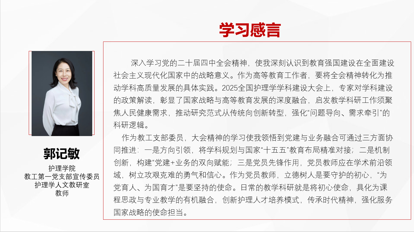 在党的二十届四中全会精神指引下,护理学院坚持以党建为引领,切实提高政治站位,勇于担当、主动作为,认真抓好贯彻落实,促进护理学科高质量发展。10月23-25日,学院党委组织党委委员、支部书记、支部委员、学办主任、团委书记等在集体学习中国共产党第二十届中央委员会第四次全体会议公报的基础上,共同参加 “2025全国护理学学科建设大会”,紧扣“融合·突破·引领——科研新范式,护理新篇章”主题,加强深入学习和交流,进一步推动党建与业务深度融合,为护理学科高质量发展注入强劲动力。