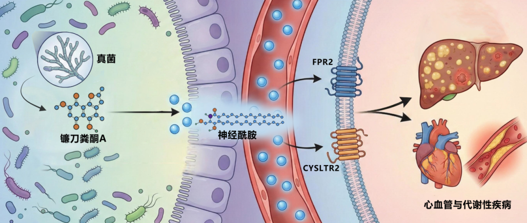 北京大学团队前期系列工作发现神经酰胺是宿主感知肠道菌源酶及其代谢物的关键信使,可介导人体肠、肝、脂肪等器官间相互作用,进而影响心血管与代谢性疾病进程。近期研究中,联合团队首次发现了神经酰胺的宿主受体FPR2、CYSLTR2,犹如钥匙插入锁孔,随即启动血管内皮炎症、免疫细胞浸润及脂质沉积等一系列级联反应,直接加重动脉粥样硬化等心血管与代谢疾病的病理进程。