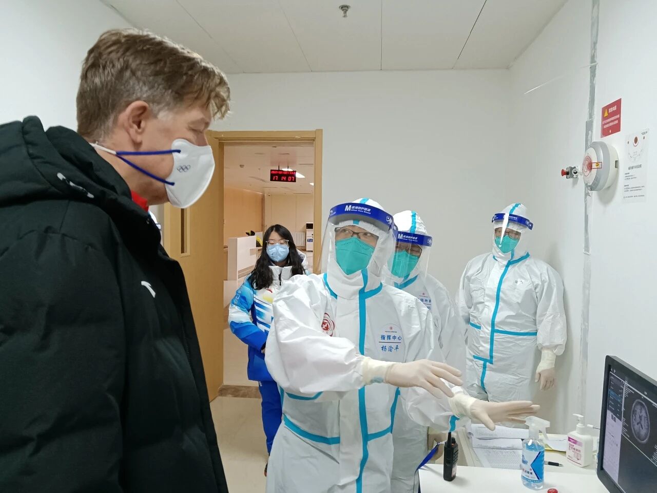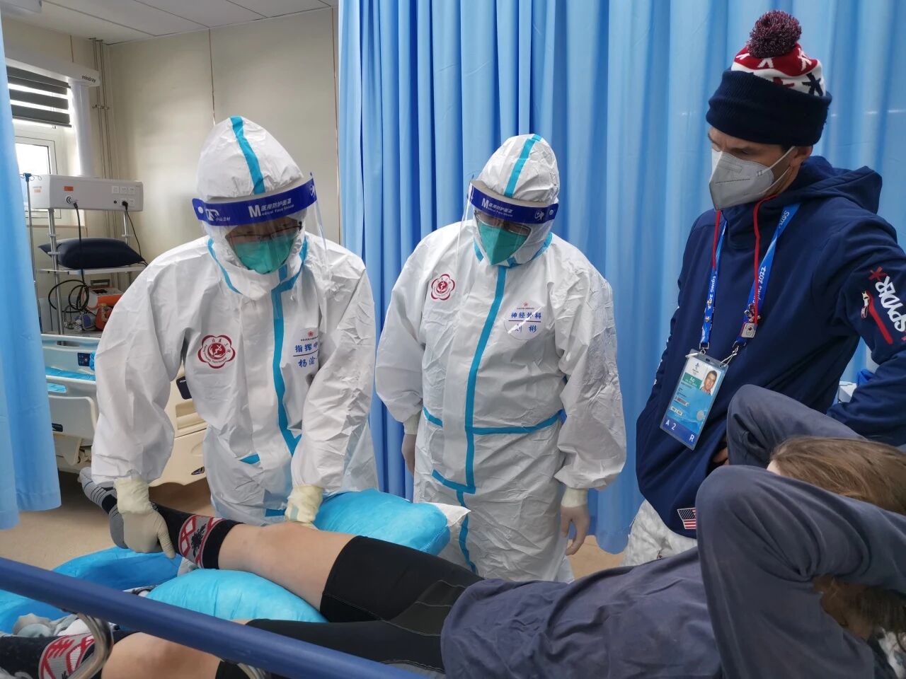 北京冬奥会期间杨渝平(左1)给美国运动员诊疗