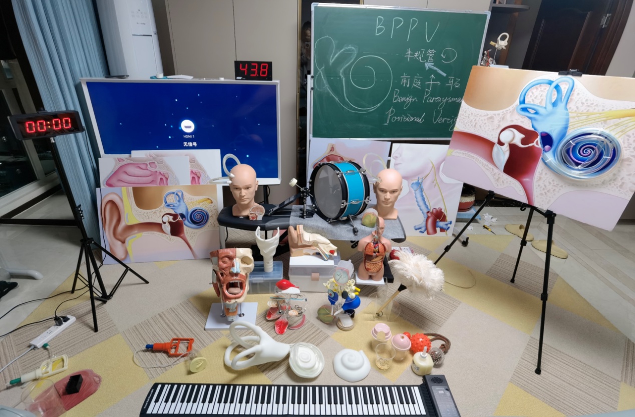 为解决内耳结构复杂和听力图枯燥等教学难题,实现抽象概念具象化,赵一馨也尝试了鼓、分贝计、手卷钢琴等教具。她曾用鼓代表内耳传声系统,鼓面模拟鼓膜震动,鼓槌模拟听小骨。当时为找到合适鼓具,她跑遍市场买了五六种鼓,反复试验,最终选定架子鼓的底鼓,模拟出耳硬化症部分过程。这一过程虽充满挫折,却让教具更好地服务于教学。