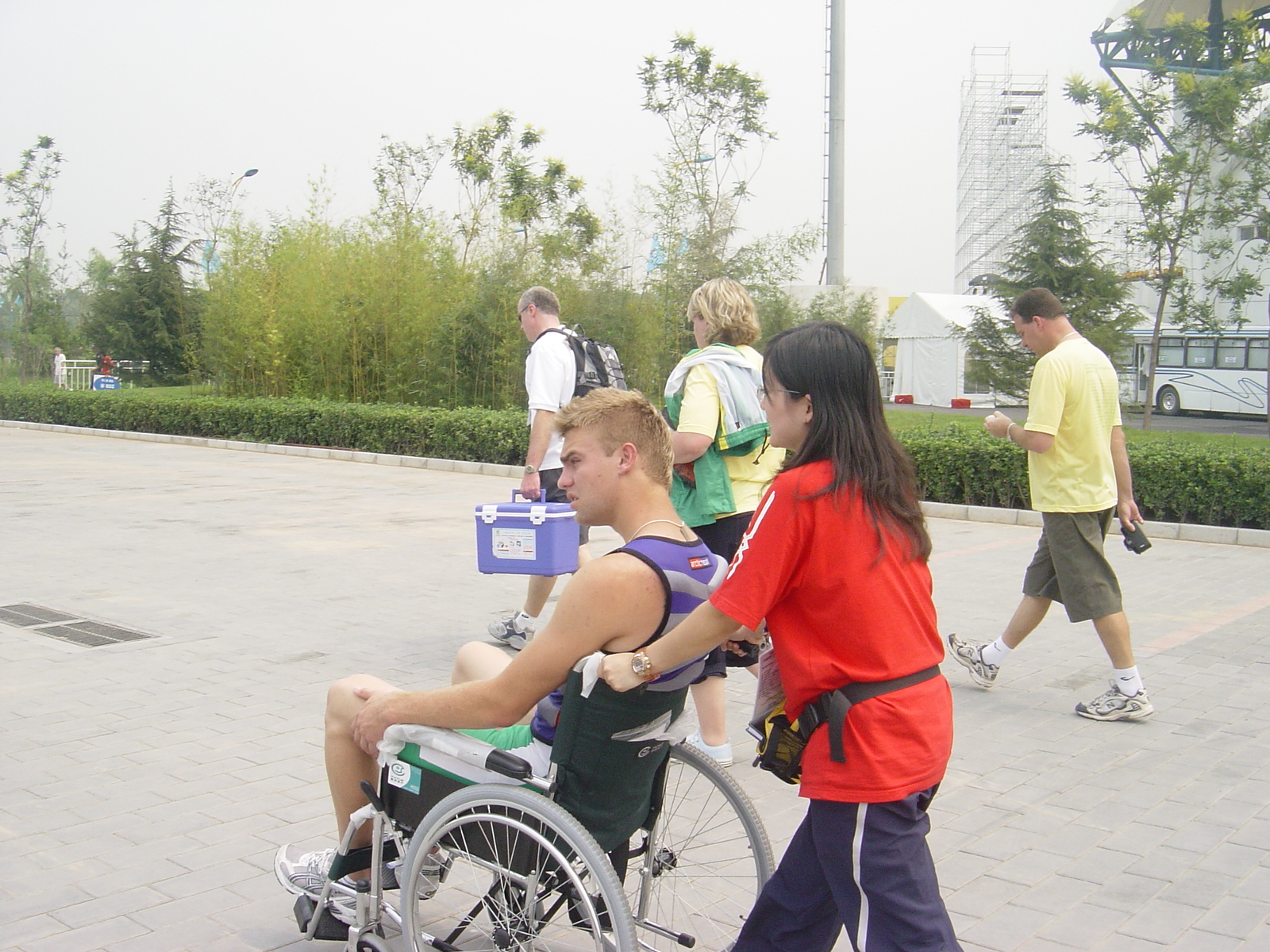 80中的医疗部志愿者只有来自北京大学医学部的金戈和袁家佳同学两个人,他们的任务是协助医疗部医生为运动员的身体健康服务。运动员训练时,他们密切注意运动员身体状况,如果发现运动员不适及时报告医疗部医生,将运动员用担架送至医疗点,协助医生对运动员进行医疗救护。同时,热情为来医疗点咨询的人提供热情地帮助。