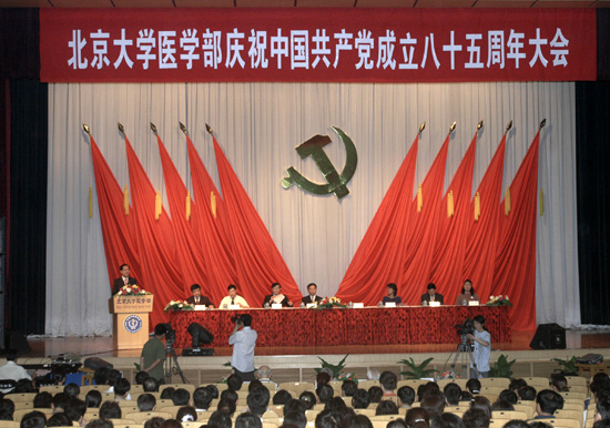 6月28日,北大医学部庆祝中国共产党成立85周年大会在会议中心礼堂隆重举行。全国人大常委会副委员长、医学部主任韩启德、北京大学党委书记闵维方、北京大学常务副校长、医学部常务副主任柯杨、医学部党委书记敖英芳、医学部党委副书记马焕章、医学部副主任刘玉村、李鹰出席了会议。北医、北大的老领导彭瑞骢、马旭、王德炳也应邀出席了会议。会议由党委副书记李文胜主持。全国人大常委会副委员长、医学部主任韩启德、北京大学党委书记闵维方和医学部党委书记敖英芳在会上做了讲话。