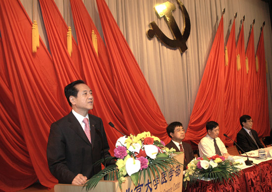 全国人大常委会副委员长、医学部主任韩启德回顾了中国共产党发展、壮大的历史,他强调,没有共产党就没有新中国,我们一定要增强信念,坚决贯彻落实科学发展观。作为北京大学的一员,我们一定要把科学研究搞上去,为国家的自主创新做出贡献。韩委员长号召大家鼓起干劲,以良好的精神面貌投入到日常的医疗、教学、科研工作中,为中华民族的伟大复兴做出贡献。