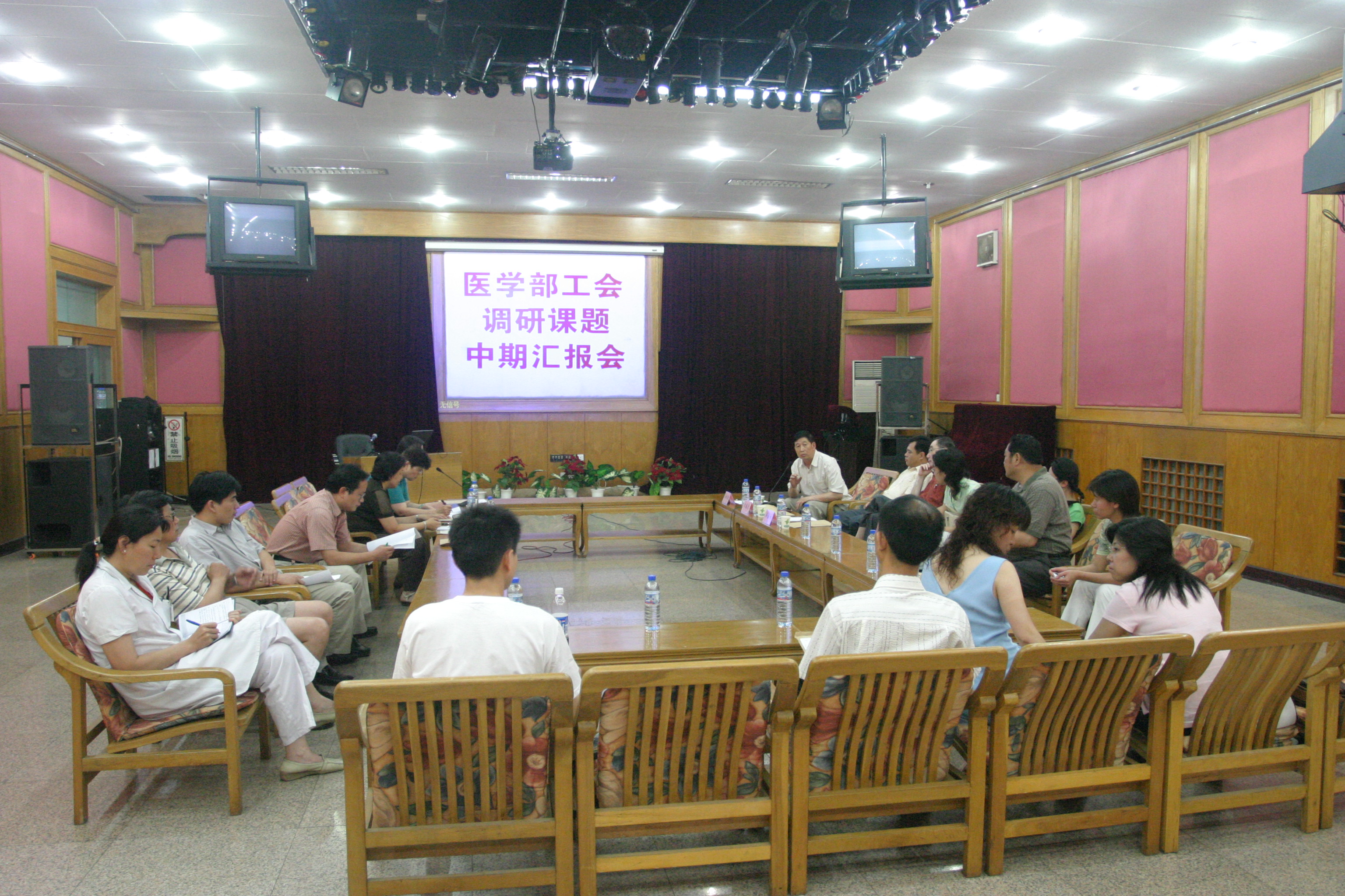 2006年7月6日上午,医学部工会在活动中心举办了调研课题中期检查汇报会。特聘请医学部党委马焕章副书记、医学部工会王春虎主席、公共教学部刘新芝教授、王玥教授、薛福林教授担任评委。 汇报会由工会刘穗燕副主席主持。