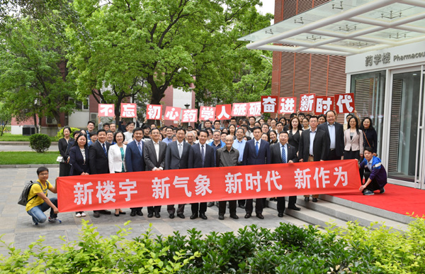 2018年5月5日下午,医学部在药学楼前举行了新药学楼启用仪式,以朴素而隆重的方式庆祝焕然一新的药学楼正式启用。北京大学副校长、医学部主任詹启敏、北京大学党委副书记、医学部党委书记刘玉村、医学部副主任宝海荣、王维民、肖渊、刘晓光、张宁,相关学院、职能部门负责人,中国科学院院士王夔先生、药学院党政班子领导、教师和学生代表近100人参加了仪式,共同见证了这一时刻。启用仪式由药学院党委书记徐萍主持。