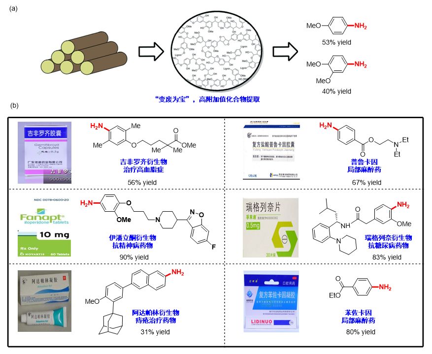 C-C键是组成有机化合物最基本的化学键,其高键能长期以来限制了烷基芳烃的转化,基于C-C键的活化一直受到化学家的广泛关注,是最具挑战性的研究领域之一。该工作成功实现了大宗化工原料经过碳碳键断裂高效高选择性地转化为高附加值化工产品的目标。木质素广泛存在于植物体中,是自然界第二大丰富可再生的碳源型芳香性高聚物,一直被视为造纸工业的废弃物,该方法能够有效的从木质素中提取有用的芳香环片段,为木质素的降解以及高附加值化合物的提取提供了重要的手段(图2,a);其温和高效的反应性使得该方法可以用于复杂分子及药物的合成与修饰,为药物先导化合物的发现及新药创制提供了简洁高效的合成基础(图2,b)。