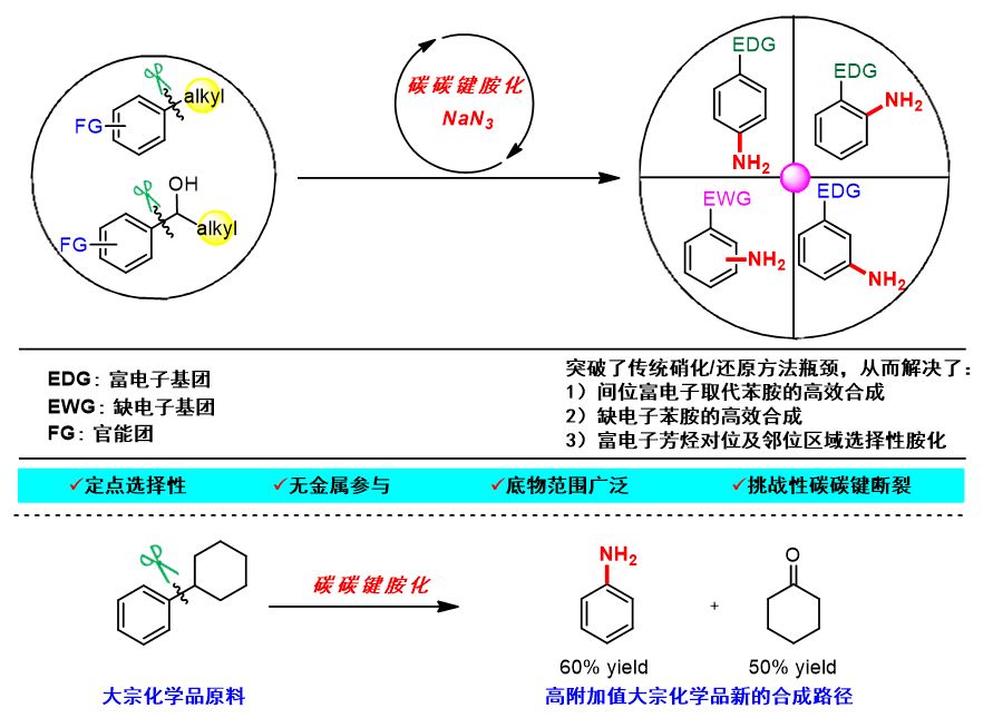 苯胺作为重要的有机合成子和基本的化工原料,广泛应用在染料、医药、农药、炸药、香料、橡胶硫化促进剂等领域中。由其制得的化工产品有300多种,其中合成的享有“第五大塑料”之称的新型有机高分子材料聚氨酯的应用领域涉及轻工、化工、电子、纺织、医疗、建筑、建材、汽车、国防、航天、航空等重要行业。目前全球对苯胺年需求量高达500万吨以上,因此发展高效的苯胺合成方法具有很重要的合成意义及应用前景。而环己酮作为己内酰胺和尼龙的重要前体,全球年需求量也达到500万吨。传统的工业方法需要不同的工艺分别制备这两种重要的化工产品,而且反应条件苛刻。焦宁研究团队利用他们的“氮合反应”策略( Acc. Chem. Res. 2014, 47, 1137),创新性地实现了烷基芳烃经过碳碳键断裂引入氮原子、氧原子的新途径,同时解决了传统硝化/还原方法中富电子取代苯胺的选择性以及缺电子苯胺的合成难题(图1),特别是首次完成了环己基苯转化为苯胺和环己酮的新反应,从而为石油产品中碳氢化合物的高附加值转化和利用开发了新的工艺(图1)。