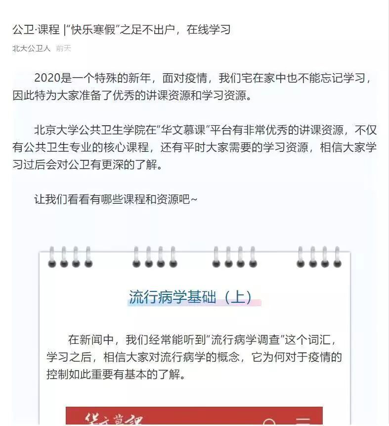 16级预防医学本科生韩沛恩同学参与2019-nCoV疫情地图的制作;作为健康传播协会会长组织推出疫情知识科普特别专题,发文阅读量20万余人次。16级预防医学本科生陈林一、程昊哲两位同学加入公众号“PKU健康传播”编撰小组,协助《“病死率”15%?“感染率”83%?别怕!一文帮你搞清数字疑云》一文成型。18级预防医学本科生余勇同学通过录制喊话视频,在会泽县融媒体上、会泽电视台播放,呼吁全县16万学弟学妹携起手来,共抗疫情。