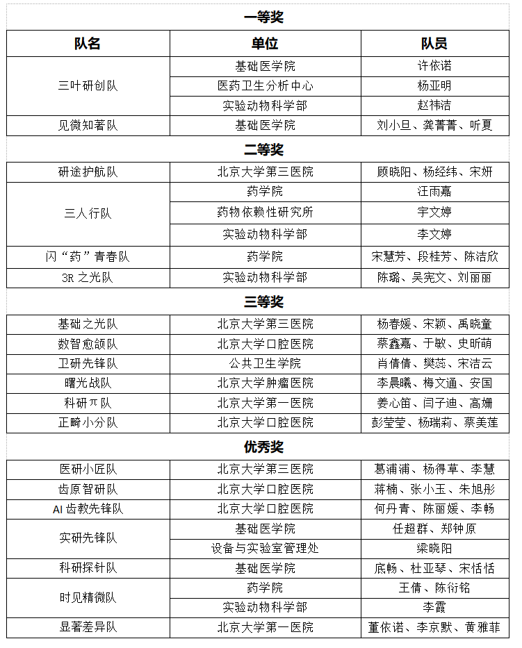 本届比赛的成功举办离不开各学院、医院的大力支持。来自各单位跨学科、跨专业背景选手的参与,充分体现了北大医学学科融合和创新发展趋势,也为更多优秀青年教师提供了交流与展示的平台。