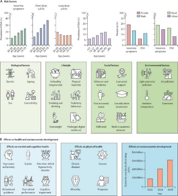 综述首先评估了中国睡眠健康的流行病学现状。文章指出,不良睡眠已给中国的公众健康和经济发展带来了日益沉重的负担。尽管部分研究显示平均睡眠时长有所增加,但失眠和阻塞性睡眠呼吸暂停(OSA)的患病率呈上升趋势,构成了严峻挑战。导致睡眠问题的风险因素复杂多样,涉及生物、生活方式、社会和环境四大领域。睡眠障碍对身心健康具有深远影响,不仅显著增加抑郁、焦虑、认知损害等精神健康问题的风险,还会加剧心血管疾病、癌症等多种慢性躯体疾病的发生率与死亡率。