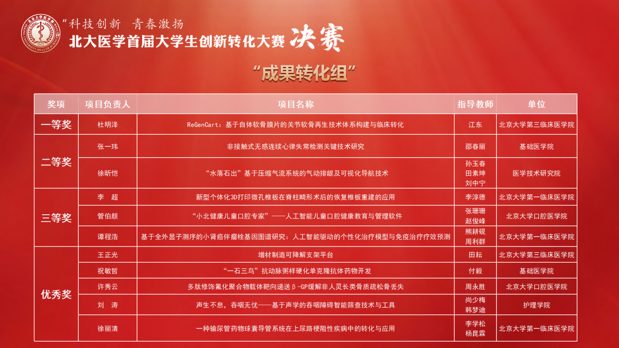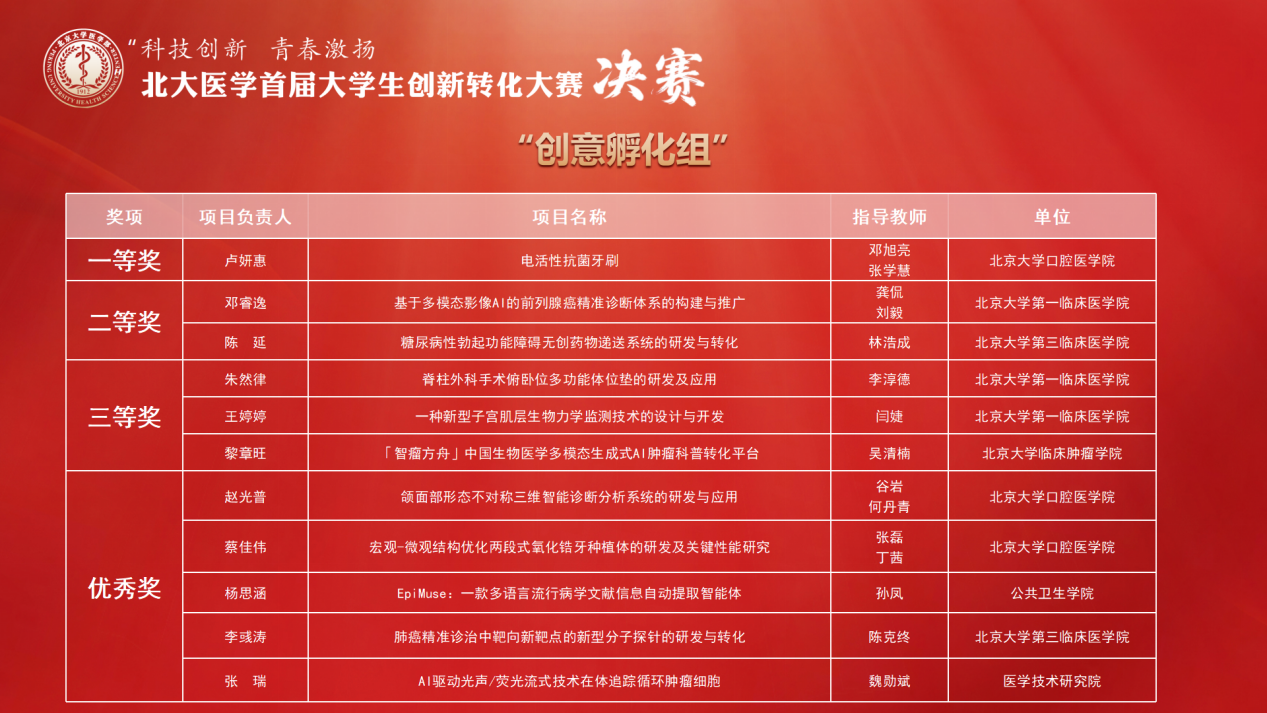 作为北大医学首次举办的大学生创新转化大赛,从半决赛的“打磨提升”到决赛的“成果落地”,赛事构建了“选拔-培育-对接-落地”的全链条创新生态,为医学创新人才成长与科研成果转化搭建有效桥梁。面向未来,北大医学将持续深化创新驱动发展战略,进一步完善“创新人才培养-科研项目孵化-成果转化落地”体系,以赛事为抓手,不断激活创新动能、厚植人才沃土,让更多医学创新成果从实验室走向临床一线,为守护人民生命健康、推动我国医学事业高质量发展注入源源不断的北大医学力量。