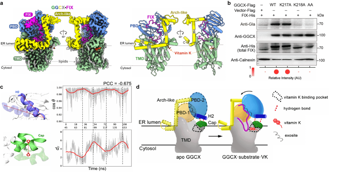 (a)GGCX•FIX复合物的冷冻电镜结构;(b)GGCX关键位点突变的酶活检测;