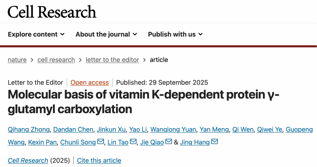 2025年9月29日,北京大学第三医院女性生育力促进全国重点实验室在《细胞研究》(Cell Research,IF="25.9)期刊发表了题为“维生素K依赖型蛋白γ-谷氨酰羧化的分子基础”(Molecular basis of vitamin K-dependent protein γ-glutamyl carboxylation)的最新研究成果。