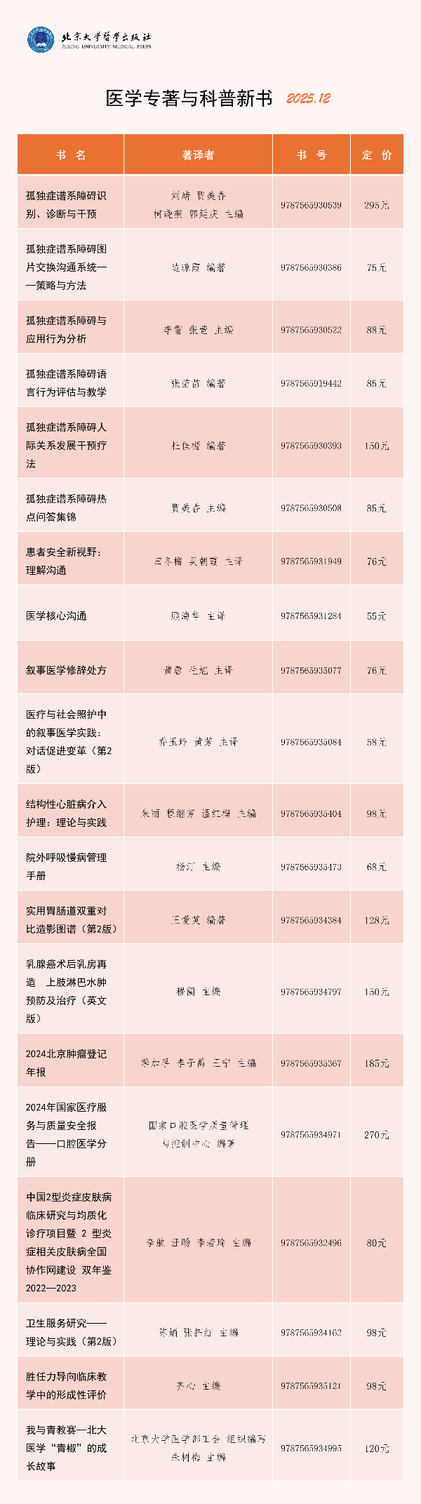 十二月,北医新书单为您带来内科学、外科学、精神病学与心理健康、公共卫生、医学教育、医学人文等领域的新书。本期的特别推荐为“孤独症谱系障碍诊疗康复系列丛书”和“北京大学医学人文学院医患沟通译丛”。