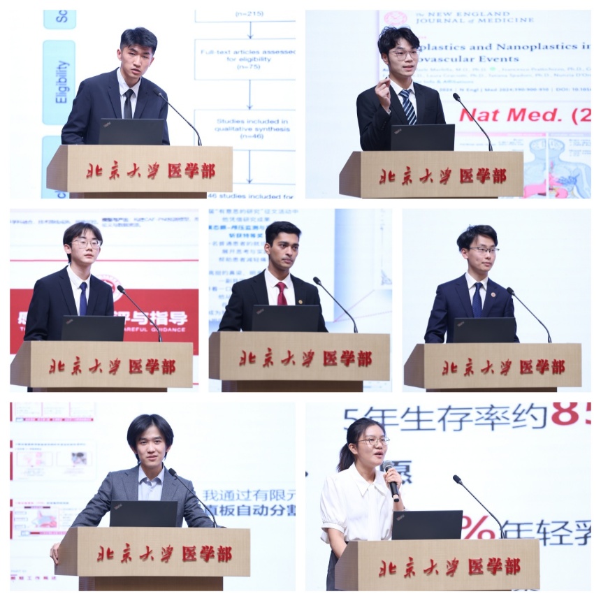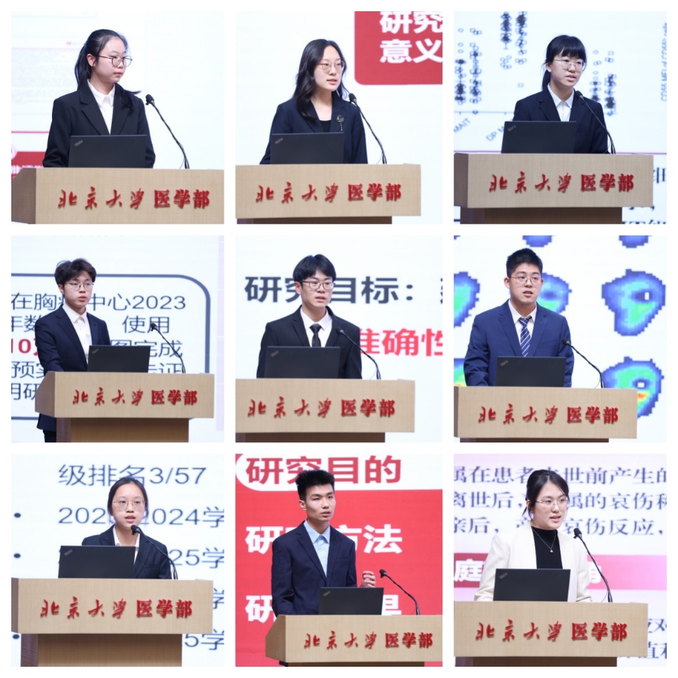 25位同学依次进行了答辩展示。同学们围绕研究背景、内容设计、创新点、预期成果及个人科研成长等方面进行了精彩汇报,内容涵盖肿瘤机制、人工智能辅助诊断、生殖健康、环境与健康、医学人文等多个前沿领域,充分展现了北大医学本科生扎实的科研素养、开阔的学术视野和昂扬的创新精神。