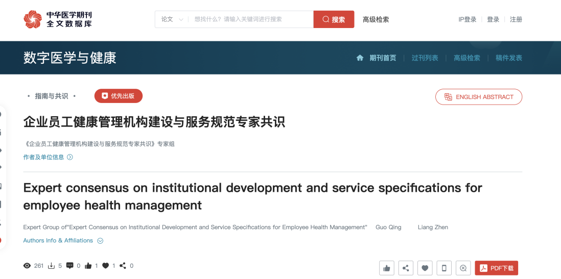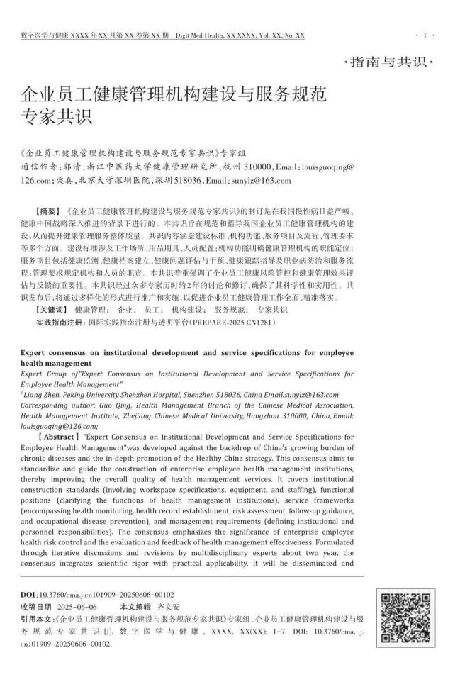 近日,由北京大学深圳医院(以下简称“北大深圳医院”)主要发起并牵头起草的《企业员工健康管理机构建设与服务规范专家共识》(以下简称《共识》),在中华医学会旗下期刊《数字医学与健康》正式刊发。此举是医院在企业员工健康管理领域深化医防融合、推动实践转化的一项重要成果,标志着医院在整合临床与公共卫生资源、构建“预防筛查-精准诊疗-健康干预-动态随访”全流程企业健康服务闭环方面取得了实质性进展。
