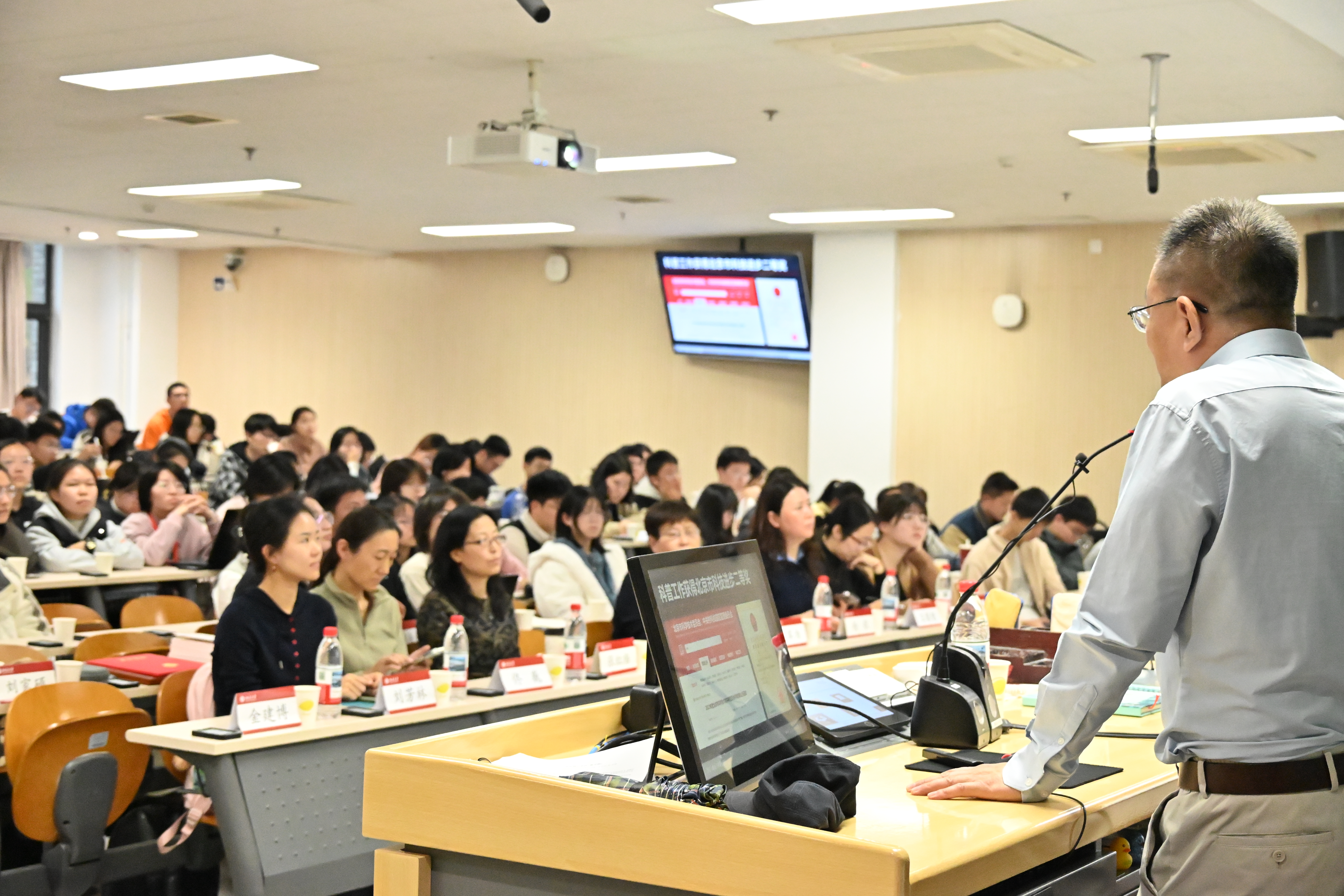 随后,薄世宁结合多年实践经验,系统阐述了医学科普的六个核心心法,用生动案例为新生搭建起专业与大众之间的沟通桥梁。他强调:“故事是交付知识的最佳载体”,并以1870年英国“船长号”炮塔舰因过度设计而翻沉的历史,关联“少即是多”的哲学思想与过度医疗的反思,让受众在共情中理解专业道理;“跨界能迅速降低认知门槛”,他用经济学家通过‘不买保险’识别恐怖分子的案例,类比癌症靶向治疗的精准打击原理,使复杂机制一目了然;“构建清晰思维模型”,他提出“医疗的本质是支持生命自我修复”的核心观点,将各类医疗行为统一归结为为人体自我修复创造条件;“Show me,not tell me”理念,他通过1832年伦敦霍乱期间托马斯·拉塔医生用羽毛管实施静脉输液的案例,直观展现医疗技术的革命性意义。“语言是刻画人物的核心工具”,他通过林巧稚医生弥留之际“快拿产钳来”的呼喊、格林巴利综合征患者“我害怕闭上眼就永远睁不开了”的倾诉的例子,强调语言的力量能够直抵人心;“好内容需兼具知识、认知与同理心”,他表示知识是准确的底层基础,认知是深度理解的核心区分度,同理心是服务人类情感需求的最高层次。2025级基础1班杨雅雯表示:薄老师将反恐与靶向治疗类比,让我瞬间理解了抽象的原理。原来高深的学问也可以通过如此生动的方式呈现,这为我未来的学习打开了新思路。