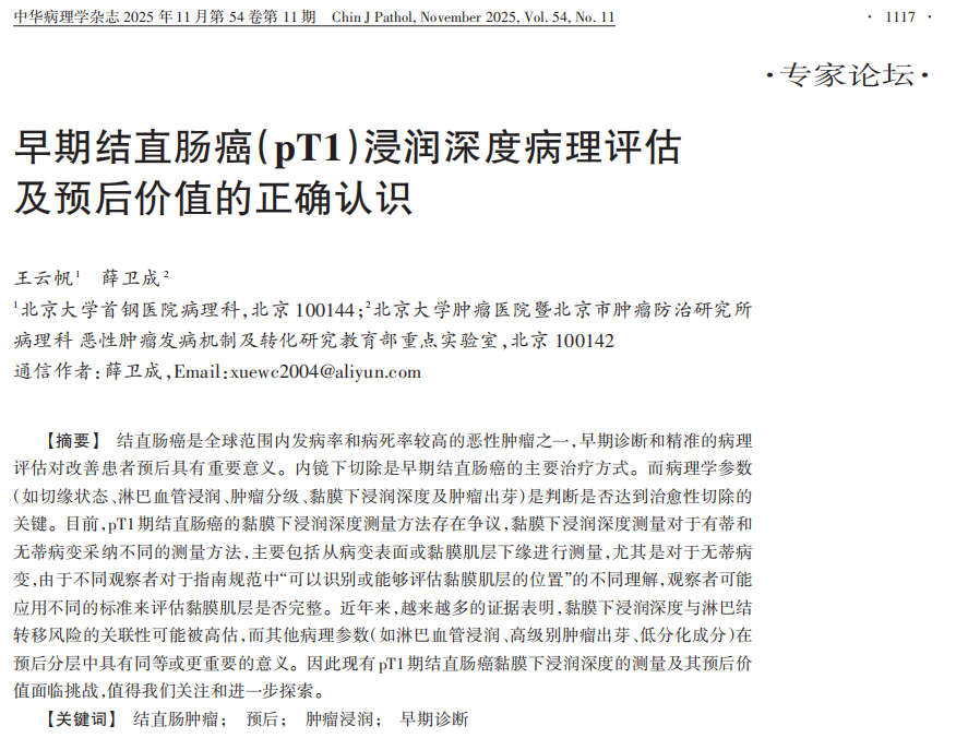 近日,北京大学首钢医院病理科主任王云帆撰写的学术论文《早期结直肠癌(pT1)黏膜下浸润深度评估的争议与预后价值再认识》,在国内病理学权威期刊《中华病理学杂志》正式发表。该文章直面当前pT1期结直肠癌病理评估中的核心难题,对黏膜下浸润深度的测量方法及其预后意义的传统认知进行了系统性梳理与深度剖析,为破解该领域的诊断困境提供了崭新的理论视角。