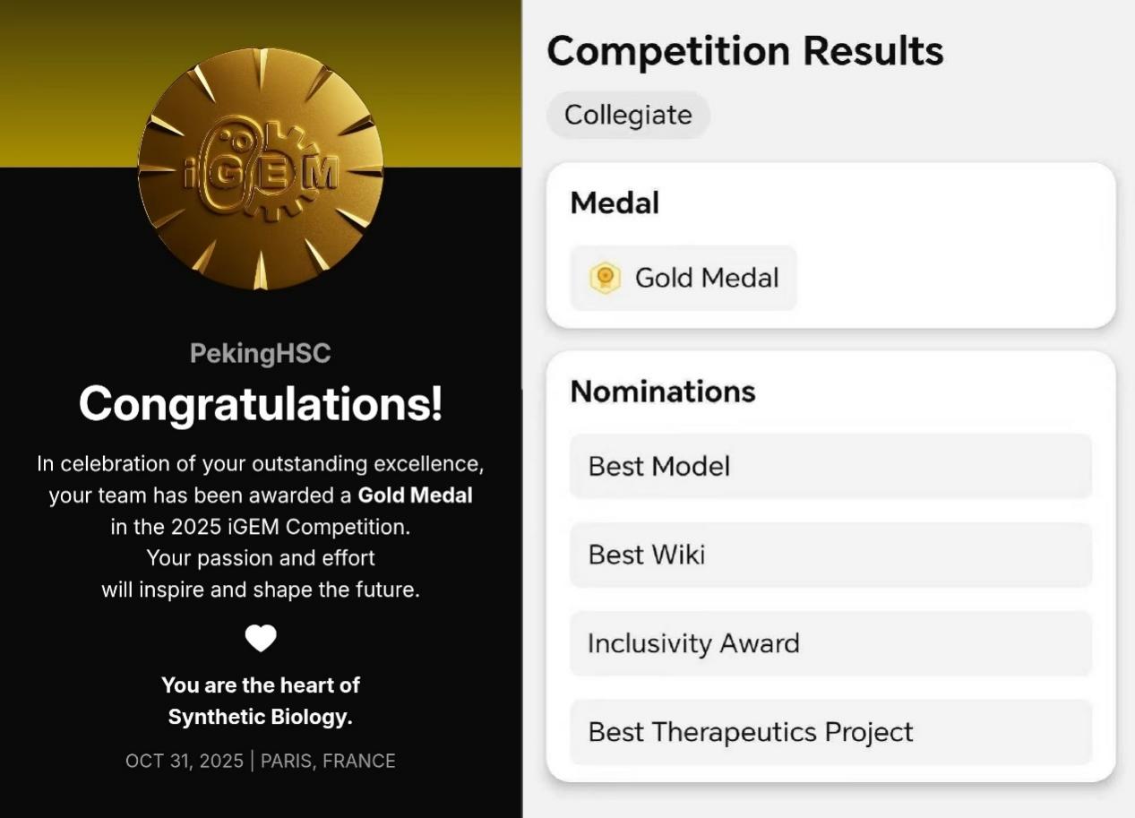 第22届国际基因工程机器大赛(International Genetically Engineered Machine competition, iGEM)于北京时间11月1日在法国巴黎落下帷幕。由北京大学药学院本科生主导,联合基础医学、口腔医学等多学院本科生组成的PekingHSC 2025团队,在竞争最为激烈的"治疗(Therapeutics)"赛道中表现卓越,不仅斩获金奖,更同时包揽"最佳治疗项目""最佳模型""最佳Wiki"和"最佳包容性项目"四项提名,创造PekingHSC队史最佳战绩。