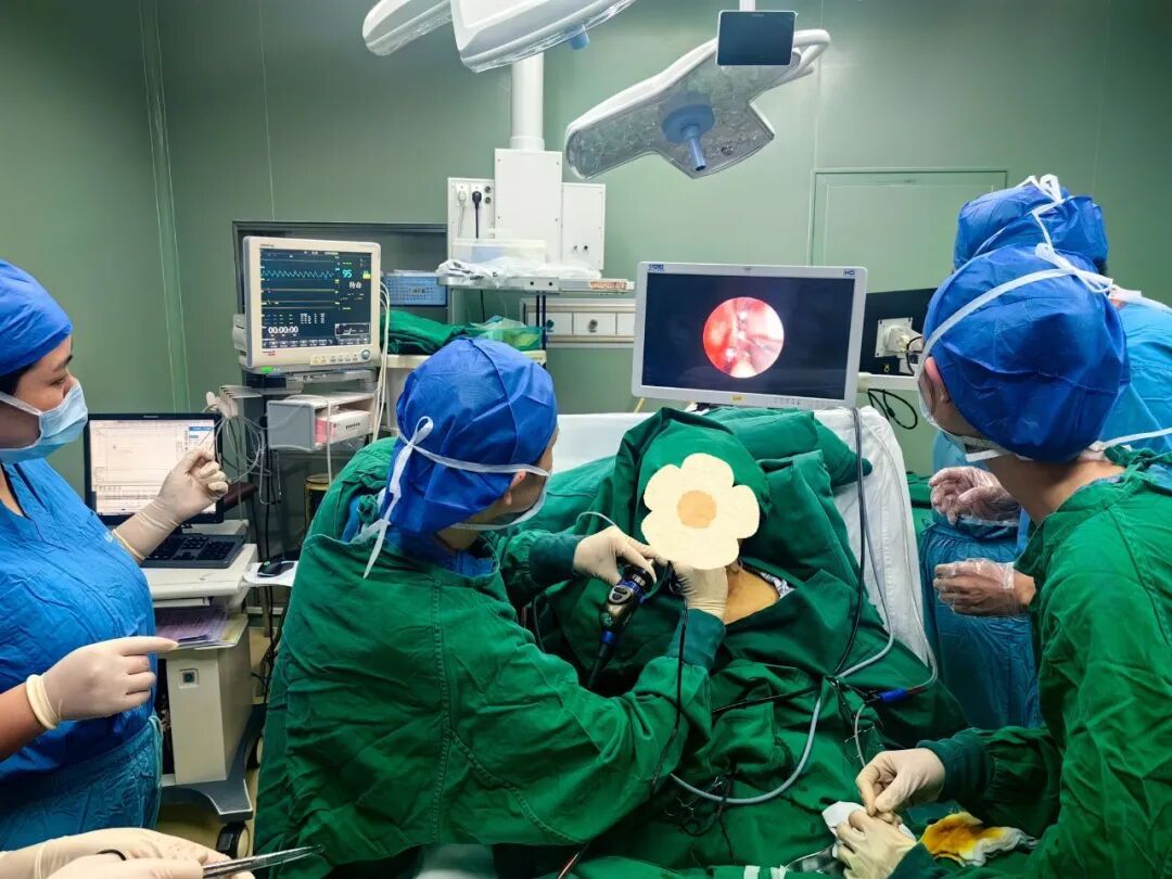 11月19日,手术室里气氛紧张而有序。在手术室工作人员的全力支持、麻醉科邓莹主任医师的保驾护航下,凌云鹏带领团队通过患者左侧肋间单一微创切口,首先在心脏表面精准搭建起冠脉旁路血管,成功打通缺血心肌的 “供血生命线”。随后,在经食道超声的实时引导下,缝合左室辅助泵,让人工心与患者自身心脏形成“并联协作”。