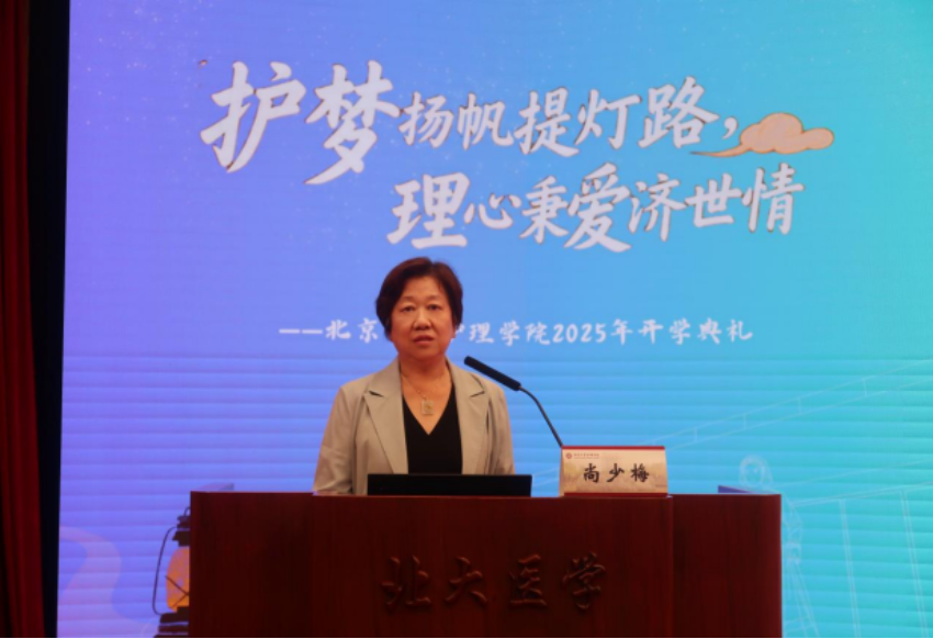 护理学院院长尚少梅在开学典礼上向新生介绍护理学院40载风雨兼程的发展历程,展示了北大护理响时代号召,应发展需求,建优质体系,育拔尖人才,迈进国际一流行列的前行步伐,殷切寄语同学们坚定专业信心,厚植专业信仰。2025级本科新生军训三营九连连长、护理学基础教研室副教授于明明鼓励同学们在未来的学习实践中,于每一次操作、每一回临床见习中触摸专业灵魂,不忘初心、成长为有温度、有担当的护理人。医学部循证护理研究中心主任、护理学院教授王志稳以“失能失智照护与智能决策”为主题,为同学们深入解读护理学专业的前沿研究与学科前景,鼓励新生参与科研项目,培育创新思维。北京大学第三医院心内科CCU护士长王雅亭校友以“践行护理誓言,不负青春韶华”为主题展开讲座,为新生呈现了十年前护理学院的学习与生活图景,并结合个人求学与工作经历生动展现护理实践的深度与温度,引导新生深入理解“厚道”传统与“北大护理人”的深刻意蕴。