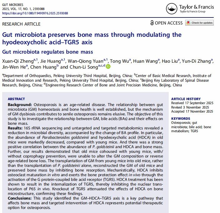 近日,北京大学第三医院骨科宋纯理教授团队在Gut Microbes(《肠道微生物》)上发表了题为“Gut microbiota preserves bone mass through modulating the hyodeoxycholic acid -TGR5 axis”(肠道菌群通过调控胆汁酸-TGR5轴减轻老年性骨质疏松骨丢失)的研究论文,揭示了肠道菌群-胆汁酸-TGR5轴在骨代谢中的作用。