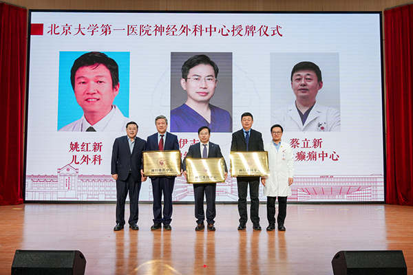 在启动仪式上,姜辉书记、江涛院士、于炎冰教授,以及北京宣武医院神经外科主任张鸿祺、北京协和医院神经外科主任赵元立、北大医院神经外科原主任鲍圣徳共同登台,为中心启动揭幕。在授牌环节,姜辉书记与北大医院大兴院区执行院长张崔建向神经外科伊志强主任、儿童癫痫外科蔡立新主任、儿外科姚红新主任正式授牌。
