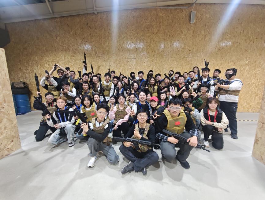 上午八时二十分,44名预科新生集体乘车前往实践地开展“真人CS”体验。在专业教练的指导下,同学们迅速穿戴好装备,分为两个小队,投入到接下来的训练体验中。本次体验共分三轮,在“团队歼灭战”中,两个队伍战术灵活,攻防有序,展现了高效的执行与配合;“保护国王”环节更考验策略与牺牲精神,队员们分工协作,守护己方国王,同时“出其不意”,绕后至对方基地一举拿下;最后一轮对抗中,两队各自派出小分队排成一列,紧密配合。攻守之间,不仅是体能与反应的较量,更是智慧、信任与担当的熔炼。