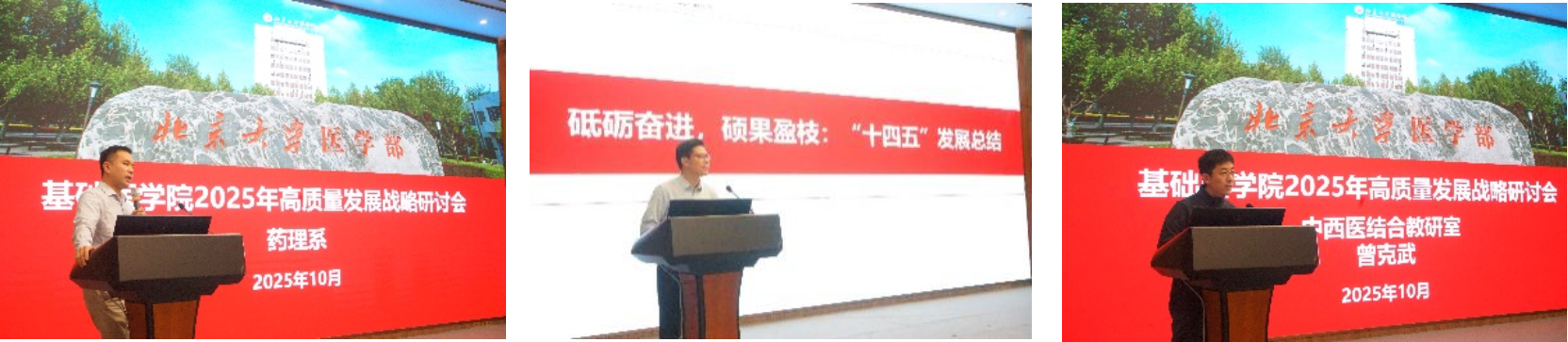 学院领导班子成员分别就科研管理、科技创新、学科群建设、基础与临床合作、产学研融合创新、本科生教学、研究生培养、学生工作以及行政服务保障等重点领域作工作思路汇报,回顾“十四五”期间的进展与不足,展望“十五五”规划与方向,强调学院将继续坚持“以临床问题驱动基础研究与应用基础研究”的导向,加强研判,精准施策,着力回答好“北大基础医学如何培养人、培养什么样的人” “如何建设世界一流重点学科”“如何打造创新型、领军型人才培养高地”“如何产生引领性的原创理论和突破性成果”等核心问题,为“十五五”期间基础医学院的高质量发展谋篇布局。
