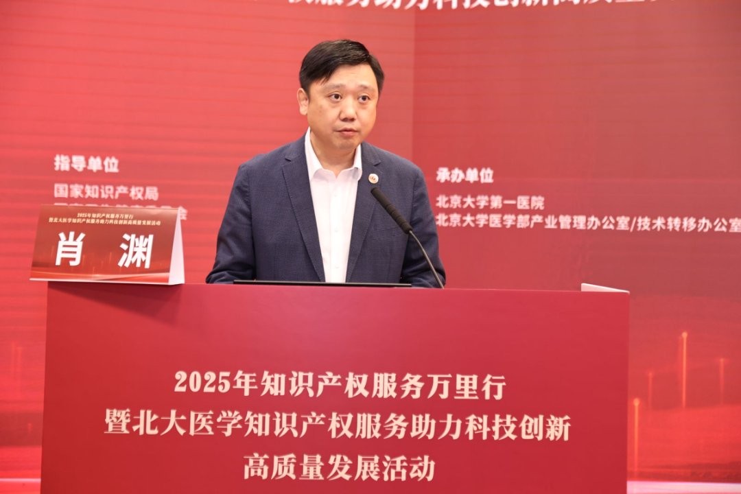 北京大学医学部副主任肖渊在致辞中对与会嘉宾表示欢迎。他指出,国家知识产权局和国家卫健委以专业精准的服务,为医学科技创新高质量发展注入了强劲动力。本次“万里行”活动选择北大医学部主办,既是对过往工作的认可,更是对未来深化“医学创新+知识产权”融合的殷切期待。他提出两点期待:一是希望知识产权服务能更精准对接医学创新需求,推动实验室成果加速落地、惠及患者;二是希望以此活动为起点,构建协同共赢的医学知识产权服务生态。