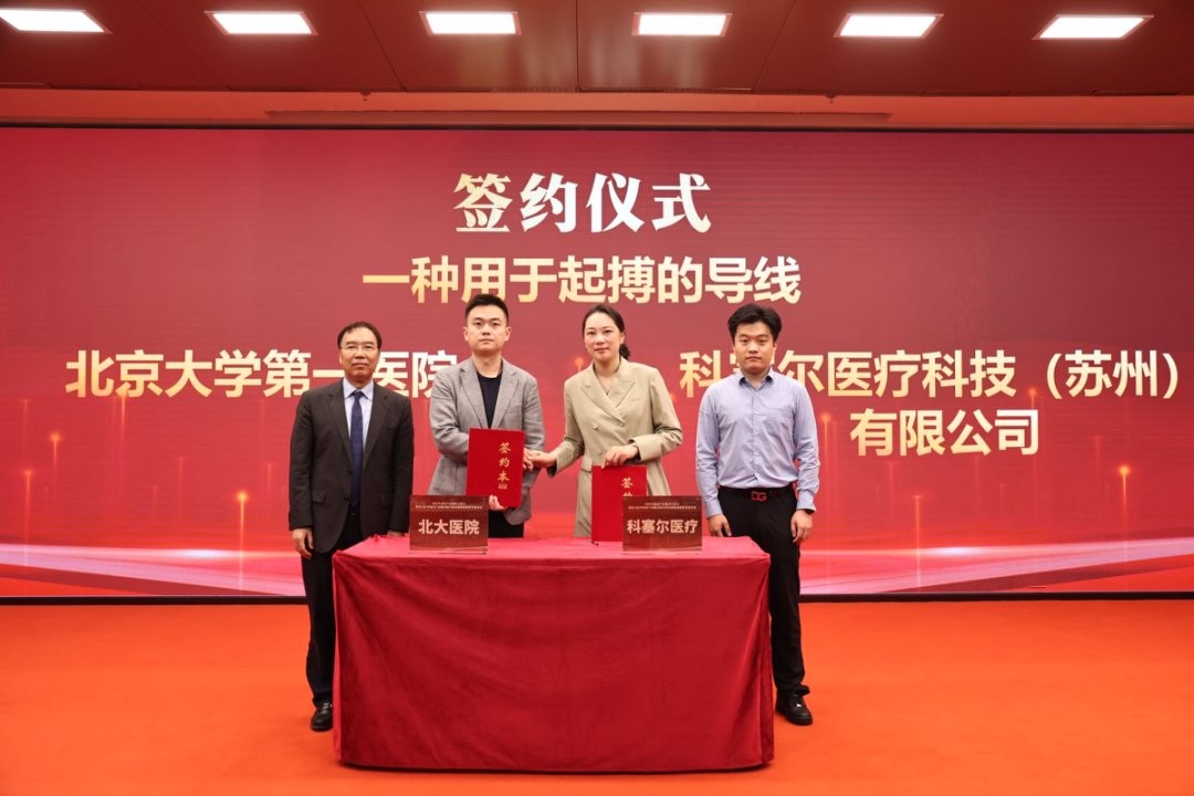 随后两项源自临床的高价值专利成功实现转化。第一个项目是“一种用于起搏的导线”,与科塞尔医疗科技(苏州)有限公司达成合作。项目负责人、北京大学第一医院心血管内科主治医师金汉和科塞尔医疗科技(苏州)有限公司总经理助理林琳作为双方代表进行现场签约,杨尹默院长、科塞尔医疗科技(苏州)有限公司董事长秘书吴之凡见签。