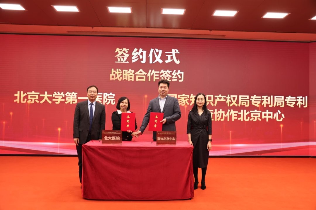 首先由国家知识产权局专利局专利审查协作北京中心与北京大学第一医院签署战略合作协议。国家知识产权局专利局专利审查协作北京中心专利服务部主任汪卫锋和北京大学第一医院科研处常务副处长李娌作为双方代表现场签约。杨尹默院长,国家知识产权局专利局专利审查协作北京中心党委委员、总审查师田虹见签。此次合作标志着北京大学第一医院的科技创新将获得国家级专利审查专业力量的深度赋能,为高价值专利的培育与布局打通“高速路”。