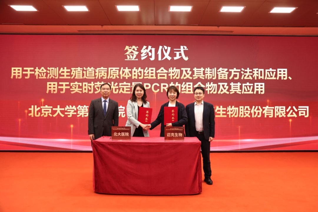 第二个项目是“用于检测生殖道病原体的组合物及其制备方法和应用、用于实时荧光定量PCR的组合物及其应用”,成功转让给迈克生物股份有限公司。项目负责人、北京大学第一医院妇产生殖医学中心副主任肖冰冰与迈克生物股份有限公司技术研究中心经理胡莞尔作为双方代表进行签约,杨尹默院长和迈克生物股份有限公司高级研发总监龙腾镶见签。