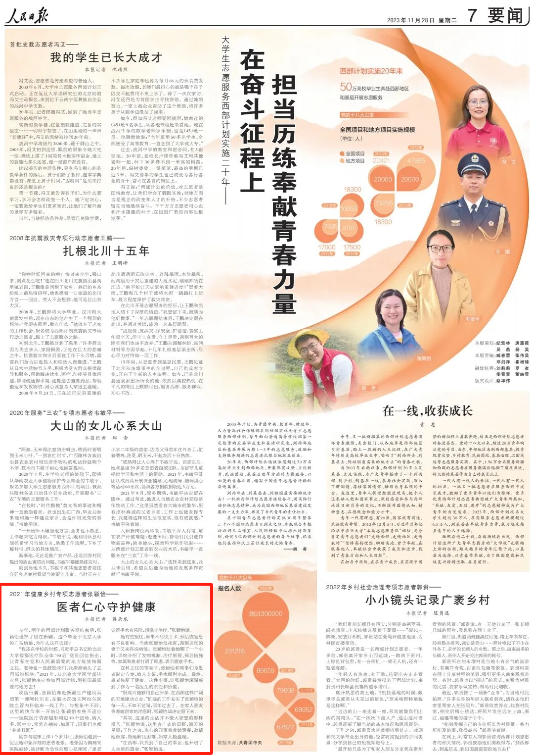 张颖怡没有辜负导师的期望,2023年,两年服务期满后,她选择继续扎根新疆,让青春在党和国家最需要的地方绽放绚丽之花,《人民日报》也对此进行了报道。“在一个需要建设的城市贡献自己的力量,是很光荣的一件事,”张颖怡说,“我想要对所有有志青年说,去祖国最需要你的地方。”