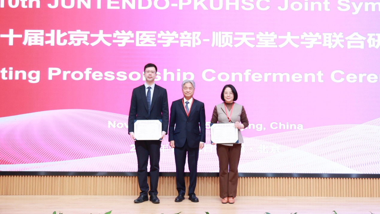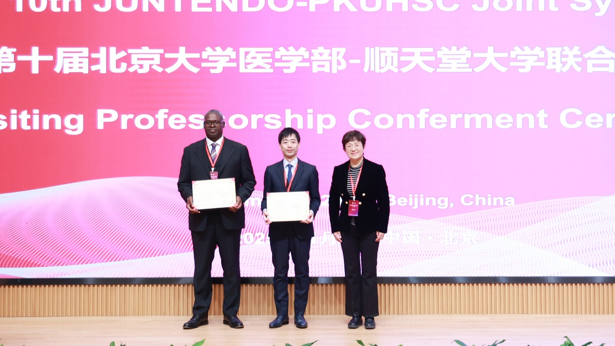 接下来进行客座教授聘任仪式。顺天堂大学校长代田浩之向乔杰授予顺天堂大学“荣誉客座教授”证书,并向王嘉东和郭莉萍授予顺天堂大学“客座教授”证书。北京大学常务副校长、医学部主任乔杰向尼勇萨巴·弗朗索瓦和内藤俊夫授予北京大学医学部“客座教授”证书。