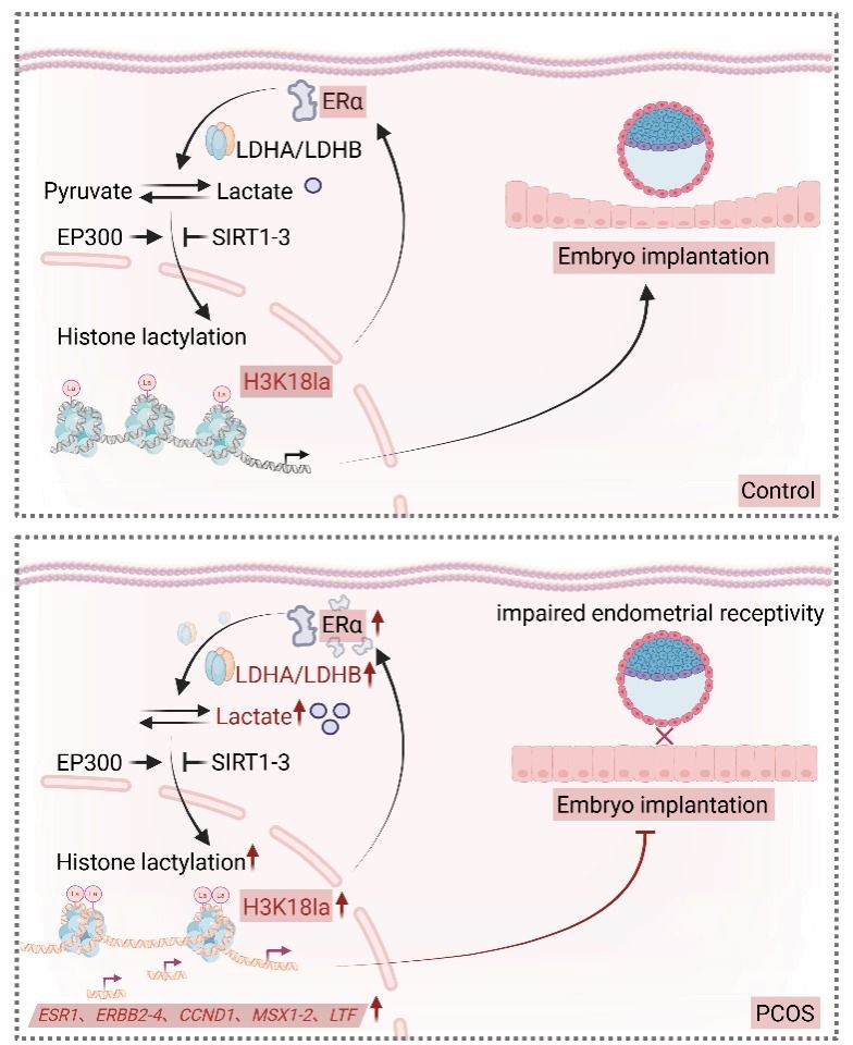综上所述,本研究系统阐明了PCOS患者子宫内膜容受性受损与ERα信号通路异常激活及组蛋白乳酸化修饰上调之间的内在联系,并揭示了ERα-组蛋白乳酸化修饰正反馈调控环路在这一病理过程中的核心作用。该研究不仅深化了对PCOS相关不孕症发病机制的理解,也为改善PCOS患者生育结局提供了潜在的治疗策略和理论依据。