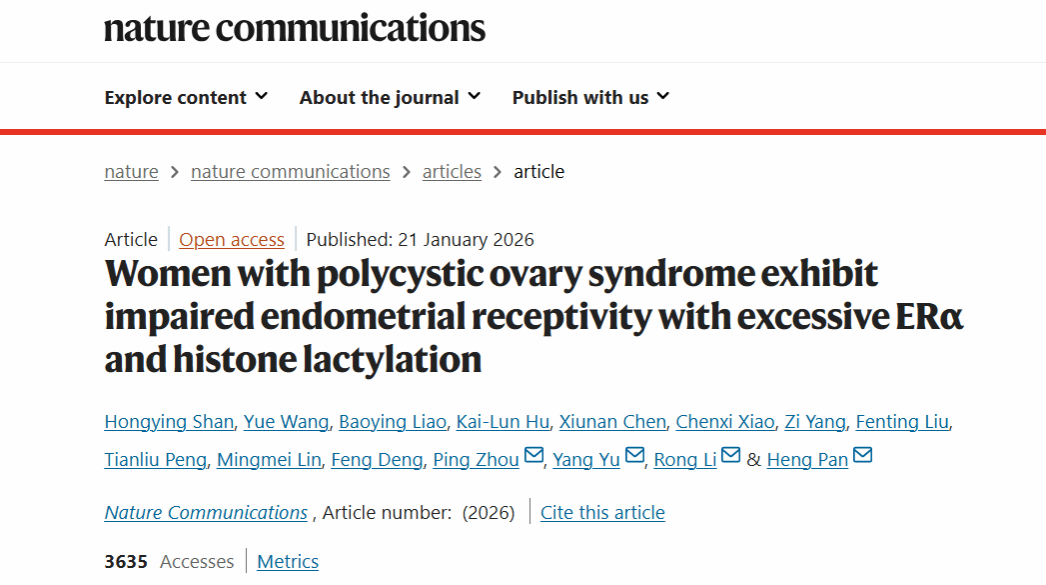2026年1月21日,北京大学第三医院生殖医学中心潘恒研究员、李蓉教授、于洋研究员、周平副研究员团队在Nature Communications(《自然—通讯》IF: 15.7)发表题为“Women with polycystic ovary syndrome exhibit impaired endometrial receptivity with excessive ERα and histone lactylation”(ERα过度表达与组蛋白乳酸化修饰异常损害多囊卵巢综合征患者子宫内膜容受性)的研究成果。该研究揭示了雌激素受体α(ERα)过度表达与组蛋白乳酸化修饰异常共同损害多囊卵巢综合征(PCOS)患者子宫内膜容受性的新机制,不仅为PCOS患者子宫内膜容受性受损的发生机制提供了新的理论依据,也对临床上建立更加安全、高效的辅助生殖体系具有重要意义。