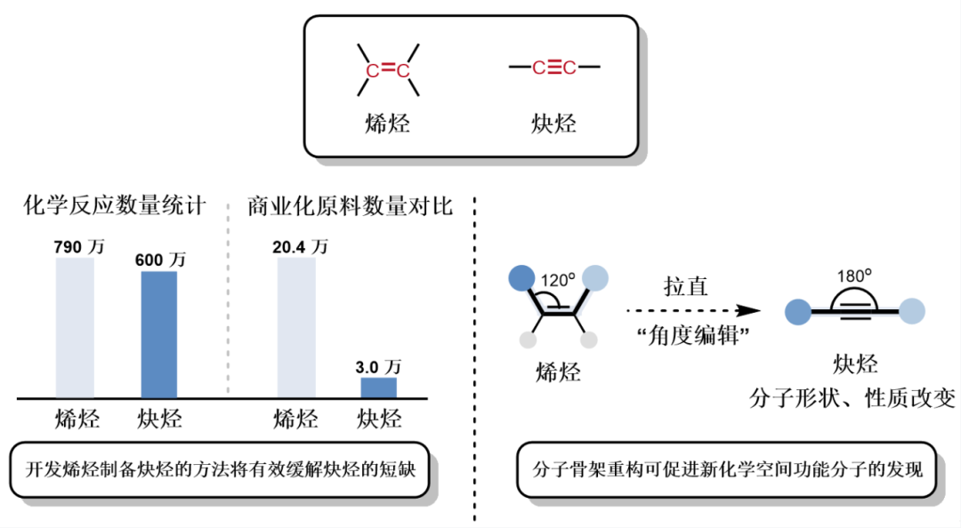 烯烃与炔烃,是现代合成化学的重要基石。从烯烃聚合、硼氢化反应、烯烃复分解到点击化学,相关突破多次获得诺贝尔化学奖,足见其科学与应用价值。然而,与烯烃因来源丰富所形成的供需平衡相比,炔烃的供给远不抵需求——种类有限、价格高昂,严重制约了其应用。此外,将折线形的烯烃“拉直”为直线型的炔烃,这一局部“角度编辑”可重塑分子整体构型与性质,为新药研发开辟新路径。因此,如何将廉价烯烃高效转化为炔烃,成为科学界持续关注的焦点。