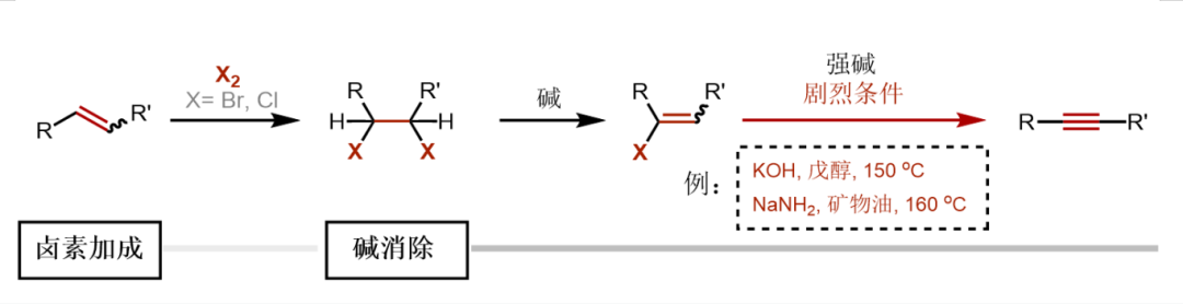 这一探索始于1861年,著名的马氏规则的提出者马尔科夫尼科夫首次报道由烯烃合成炔烃,但方法需高温强碱,官能团兼容性差(图3)。遗憾的是,此后160余年,始终未出现温和实用的替代方案。