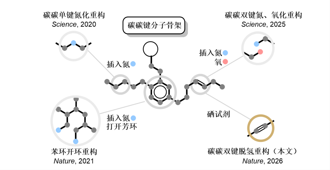 北京大学焦宁团队在碳碳键重构与转化领域已经深耕多年并积累了丰富经验(图4),通过提出的“级联活化”和“熵增重构”策略,团队实现了从碳碳单键的氮化重构(Science2020, 367, 281)、到苯环的开环转化(Nature2021, 597, 64),再到碳碳双键的断裂重构(Science2025, 387, 1083),一系列成果为本次突破奠定了坚实基础。基于上述级联活化思路,团队另辟蹊径,没有继续选择160余年来都在使用的卤素,而是设计并寻找具备活化与离去双重优越能力的新型试剂作为开启这一难题的钥匙。经过系统研究,结合团队对其氧化(Acc. Chem. Res.2017, 50, 1640)和卤化(Acc. Chem. Res.2024, 57, 3161)体系中针对硫(S)、硒(Se)试剂的催化性能研究,最终发现一种诞生于1894年的含硒杂环分子——Selenanthrene(硒蒽)兼具这种对烯烃“上得去、下得来”的双重潜力。有趣的是,自问世130余年以来,合成化学家们对该类分子鲜有问津,几乎未有研究将其应用于合成反应之中。正是这枚积满历史尘埃的“旧钥匙”,被团队用来打开一道尘封了160余年的“锁”。