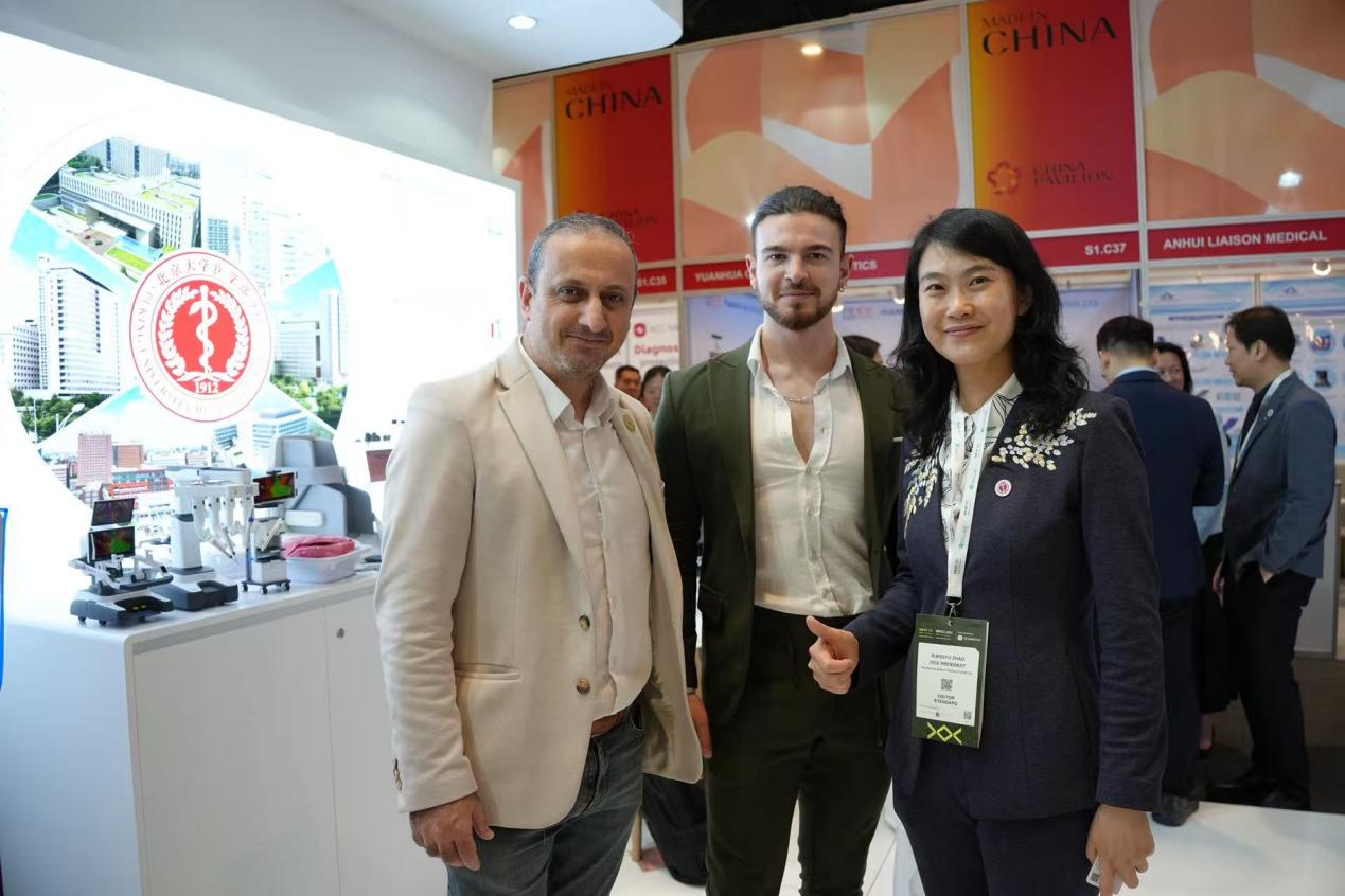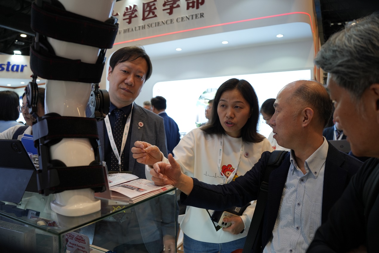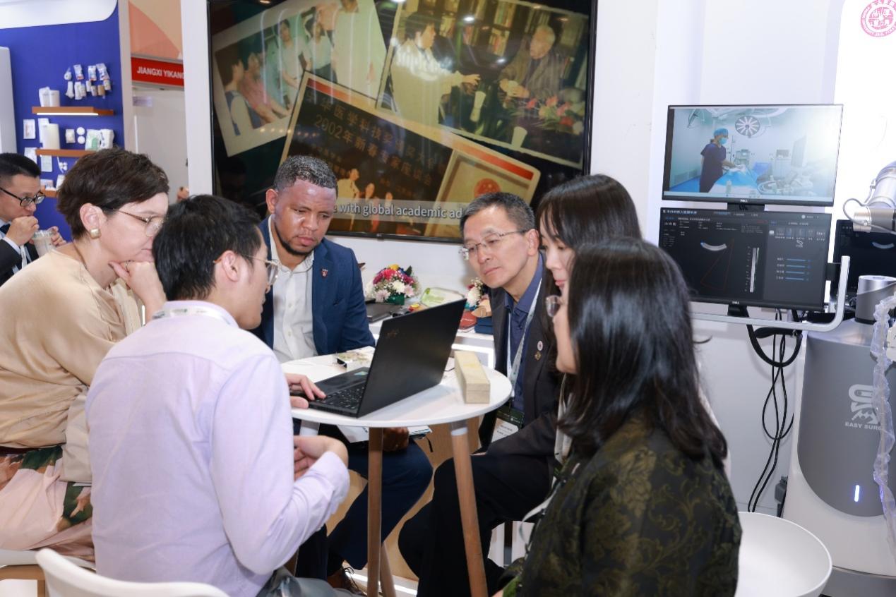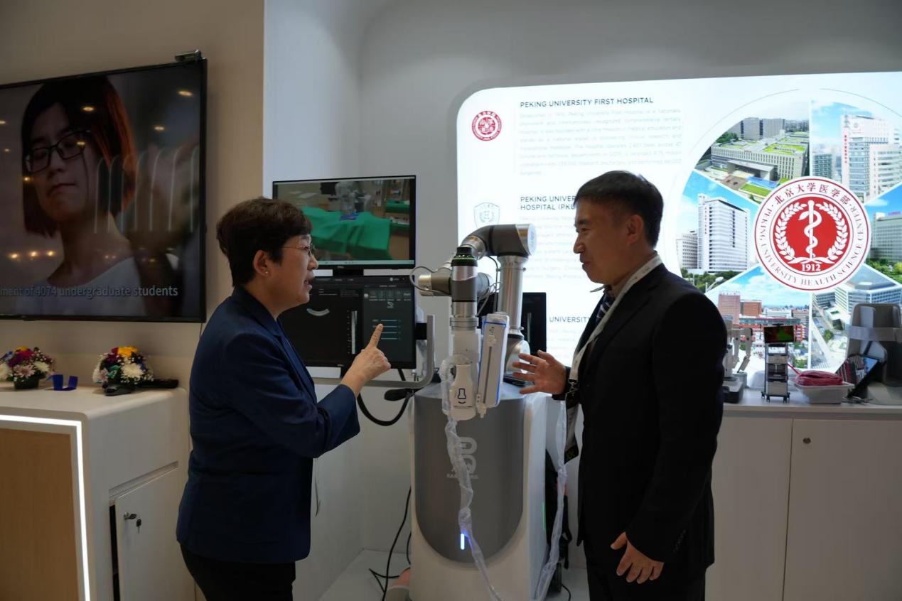 展会期间,北大医学代表团与多家国际顶尖机构开展了互访,进行医疗技术、智慧诊疗、医学教育、成果转化等多方面的交流:美国麻总百瀚(Mass General Brigham)全球咨询中东及非洲区董事总经理 Dr. Sarper Tanli来访北医展台,双方就未来跨区域医疗服务合作进行了前瞻性交流。由英国医疗局副主任David Sheppard带队的英国公立医院代表团专程访问北大医学展台,英格兰皇家外科学院事业发展与国际合作部主任Anya Yerokhina女士及伦敦大学学院全球健康商学院事业拓展总监David Huff先生与北京大学人民医院胸外科团队、北京大学肿瘤医院胃肠肿瘤外科团队就未来国际外科医师培训项目合作、与北京大学第三医院就个性化定制人工关节和组织工程软骨支架模型技术细节与临床应用数据、3D打印髋臼杯和可降解镁合金植入物所代表的精准治疗与未来材料方向等进行了全方位探讨。北京大学第一医院展出了我国自主研发手术机器人创新技术:全球首创实时超声引导经皮肾穿刺手术机器人、皮肤科自主研发真菌及分枝杆菌病原体核酸靶向测序(tNGS)分析试剂盒、肾脏病及多慢病辅助诊疗决策系统等展品,众多海内外医疗同行前来切磋临床应用与技术研发经验,加速了技术的国际化布局,推动了先进医疗技术的国际交流与普惠应用。北京大学口腔医院聚焦临床痛点与成果转化,全方位展示了从源头创新到智能诊疗的完整体系。重点推出了数字化一体化纤维桩核修复技术、基于“离子传导阻断”理论的脱敏剂及压电催化自清洁牙刷;展示了代表下一代骨再生技术的智能响应型生物降解金属骨修复材料以及通过口腔颌面混合现实(MR)技术与AI辅助诊疗系列平台(涵盖黏膜癌筛查、颌骨修复及创伤急救),构建的流程智能化解决方案。北大六院“心宝玩偶”儿童心理支持系统,依托先进技术构建实时情感交互引擎,实现与低龄儿童的自然语言沟通与情绪反馈,为孩子们带来温暖有效的心理陪伴、还有操作简便、起效迅速的“光照治疗仪”,具有无创伤、使用场地灵活的优势,对改善抑郁情绪有确切效果。这一系列兼具交互性、精准性与实用性的创新设备吸引了众多观众的驻足与交流。