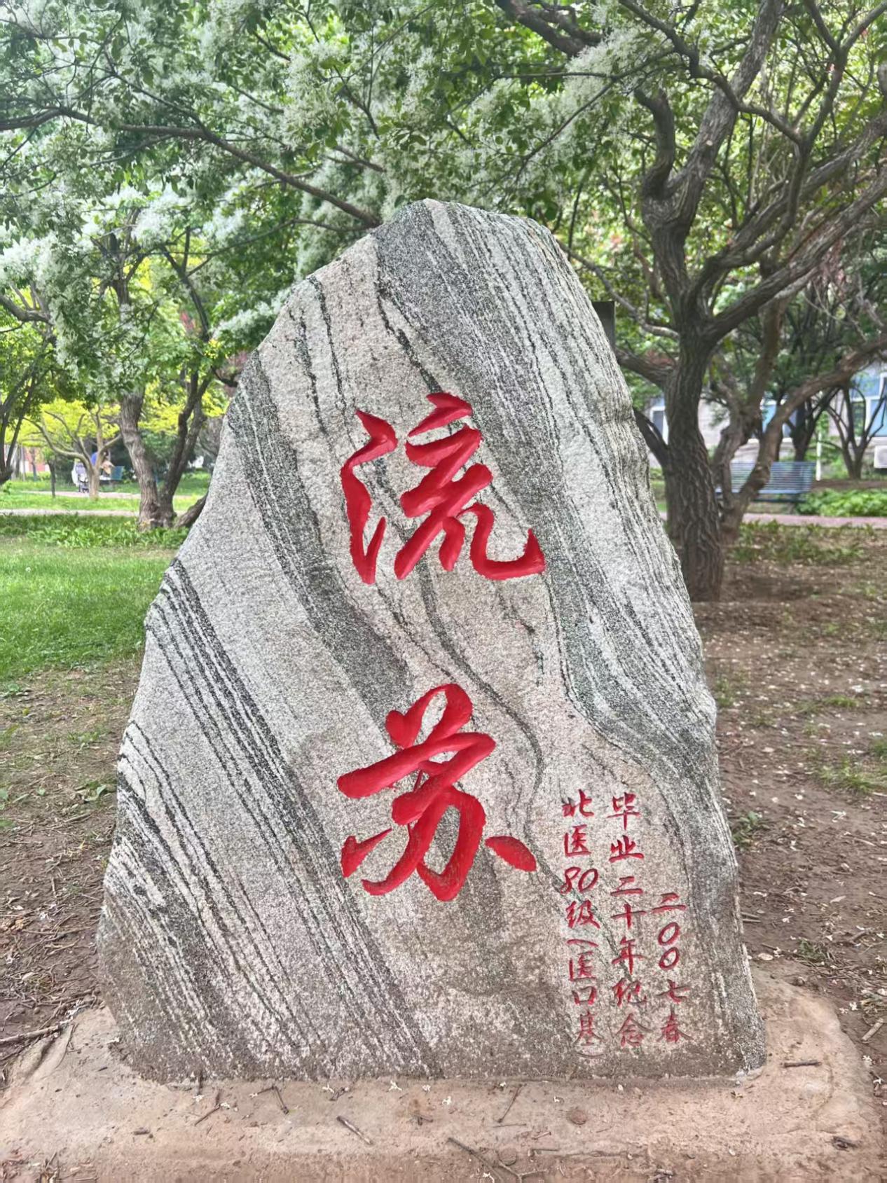 二十载春秋流转,当年意气风发的青年学子,已成长为守护生命健康的中坚力量;而这三棵承载心意的树木,也从幼苗长成参天乔木,以年年如约的繁花,续写着校友与母校割舍不断的情缘。石碑上“流苏”二字鲜红醒目,旁侧“2007 春毕业二十年纪念北医80 级(医口系)”的字样,静静镌刻着一段跨越时光的情谊,成为连接校友初心与北医精神的独特纽带。