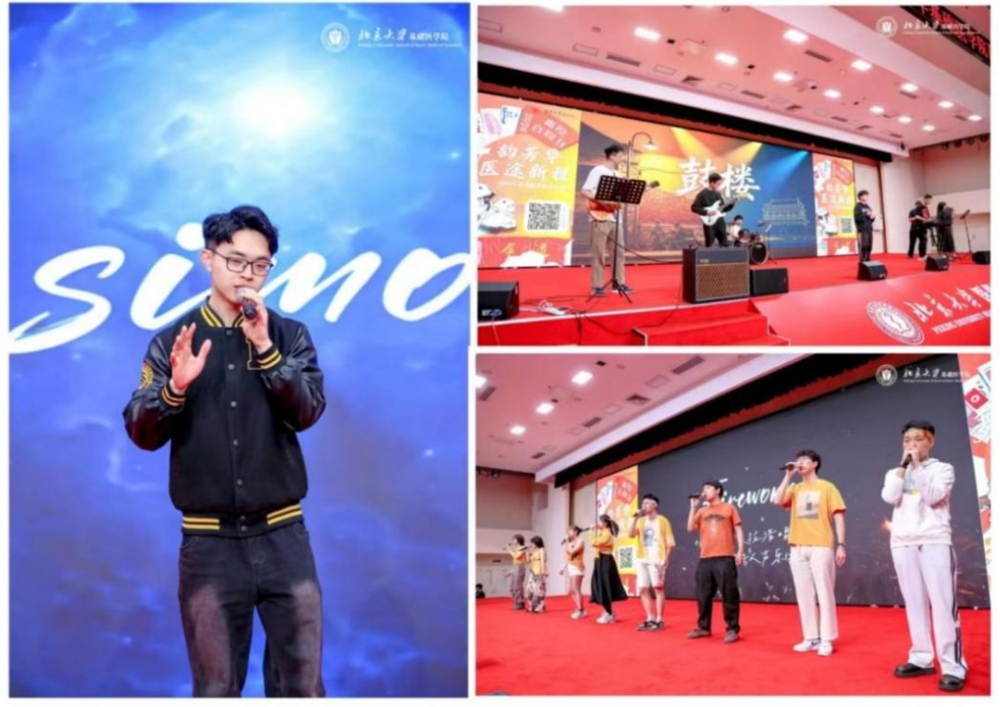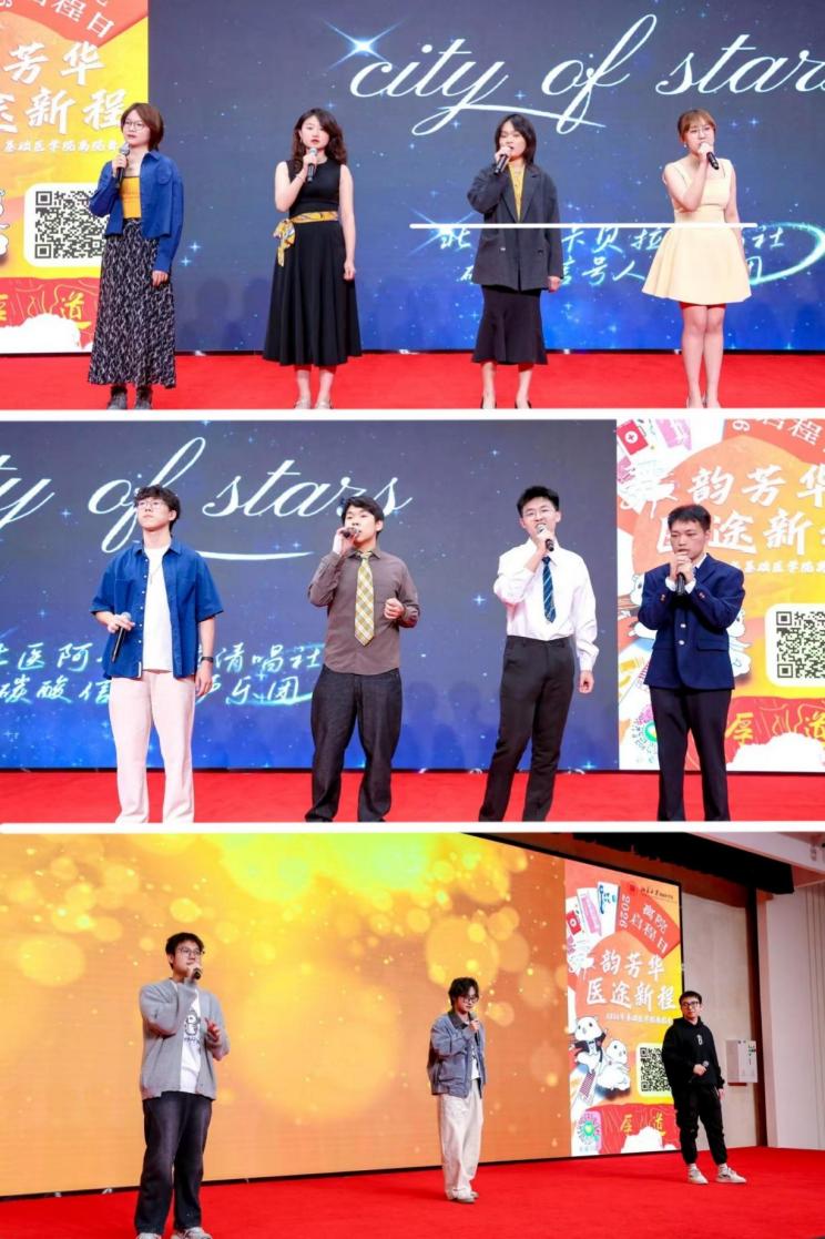 随后,舞会进入第二轮节目表演阶段,全场热情推向高点。火焰山乐队带来的《鼓楼》旋律质朴舒缓,节奏松弛自在,满是烟火气息;杨华璟演唱的《Simon》深情婉转、直击人心,赢得阵阵掌声;北医阿卡贝拉清唱社的碳酸信号人声乐团带来两首精彩曲目《Firework》《Cheerleader》,纯净的人声极具感染力,婉转悠扬的旋律穿透全场,引得同学们不由自主地拍手附和、轻声跟唱,台上台下形成默契共鸣。最后,主持人致闭幕辞,全体师生移步台前共同合影、互道珍重,将这份师生情、同窗谊深深珍藏心底,本次离院舞会在欢乐与祝福中圆满落幕。