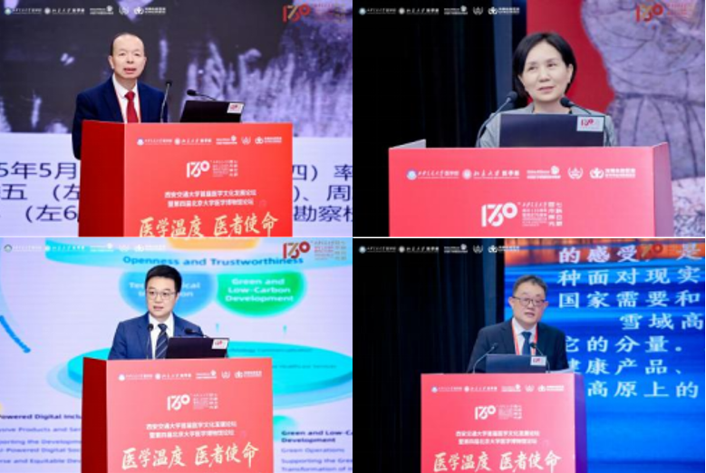 主旨报告环节,西安交通大学原党委常委、医学部原党委书记陈腾,回顾了西迁医学先辈扎根西部、坚守初心、践行医学使命的光辉历程;陕西历史博物馆党委书记、馆长庞雅妮结合文博实践,分享科技赋能文物保护与文化传承的宝贵经验;蚂蚁集团副总裁、医疗健康事业群总裁张俊杰,深入探讨AI时代下医疗创新与全民普惠的发展方向;西藏自治区政协委员、甘肃奇正实业集团有限公司总经理程若琼,系统阐释交大精神与民族医药智慧深度融合的创新发展实践。
