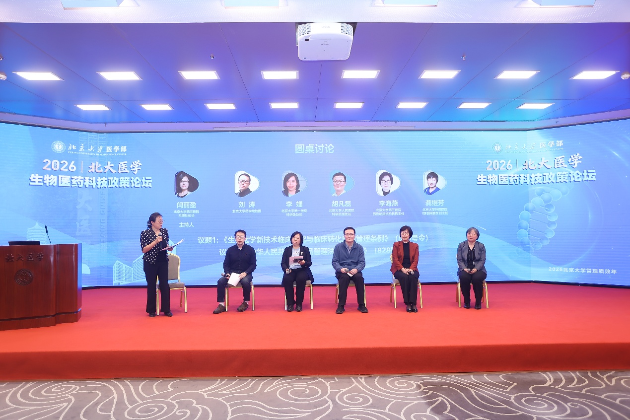 2026年4月22日,在《生物医学新技术临床研究与临床转化应用管理条例》(中华人民共和国国务院令第818号)(以下简称“818号令”)、《中华人民共和国药品管理法实施条例》(中华人民共和国国务院令第828号)(以下简称“828号令”)即将正式实施之际,“北大医学生物医药科技政策论坛(2026)”在北京大学医学部举办。论坛包括“政策解读”“实务探索”“圆桌讨论及互动问答”三个部分,管理部门、科研及临床一线专家学者与150余名师生共聚一堂,共研政策要义、共促规范创新、共话高质量发展。