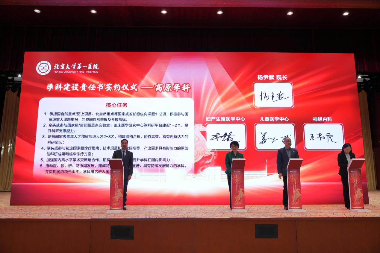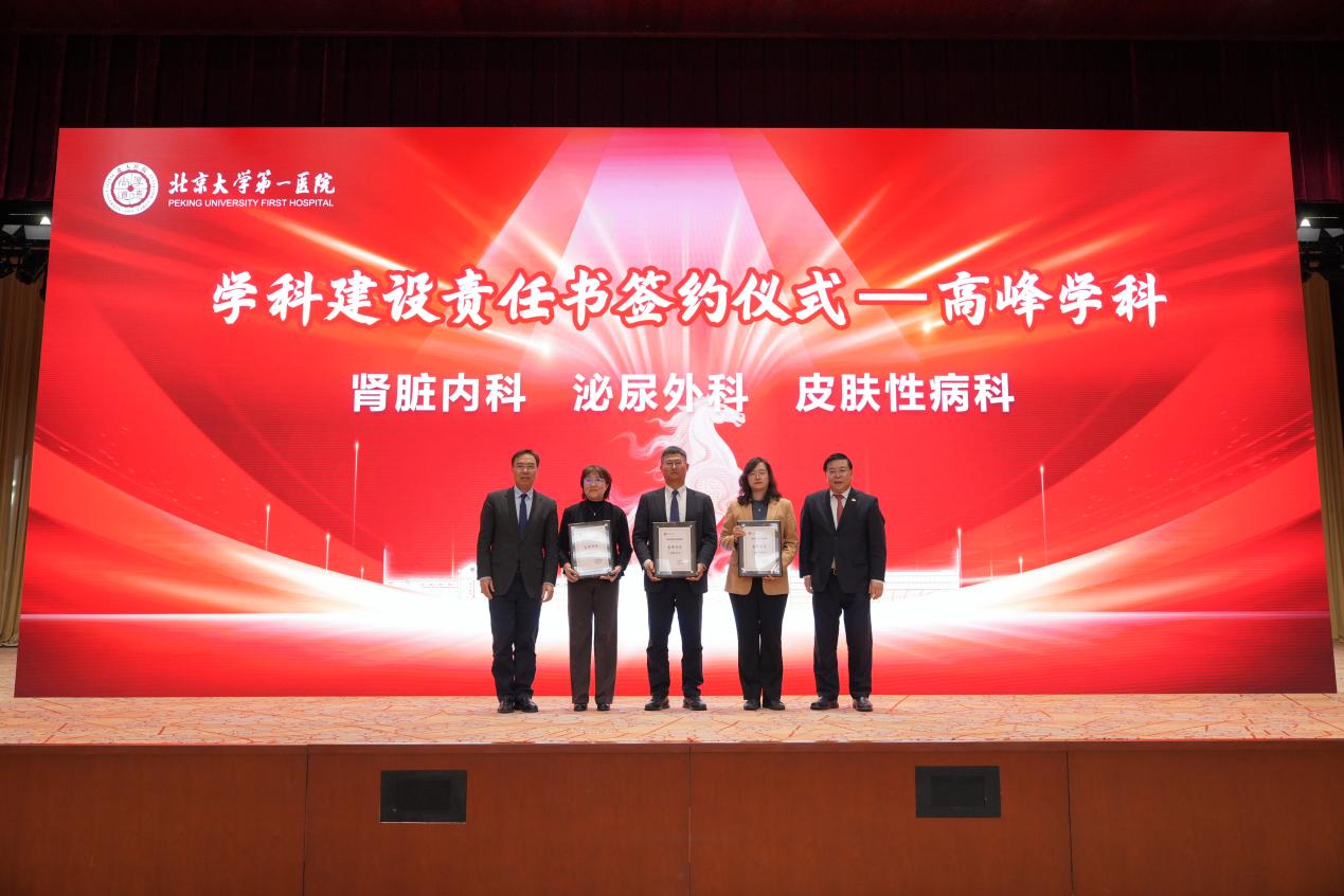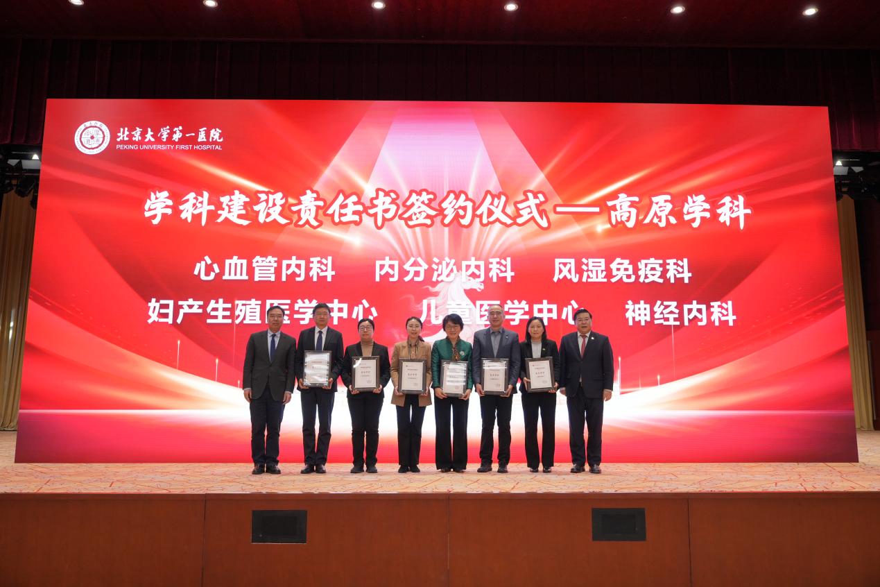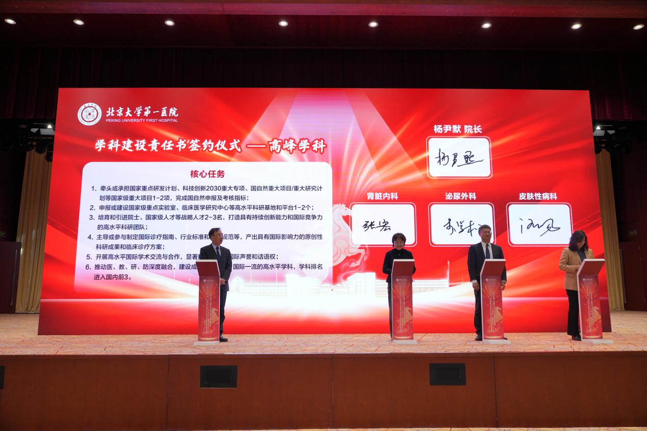 会议现场还举行了“学科建设责任书签约仪式”。姜辉书记、杨尹默院长为肾脏内科、泌尿外科、皮肤性病科3个高峰学科,以及心血管内科、内分泌内科、风湿免疫科、神经内科、妇产生殖医学中心、儿童医学中心6个高原学科授牌。随后,杨尹默院长与高峰高原学科负责人签订《学科建设责任书》,标志着北大医院学科建设正式迈入精准培育、分层突破、体系化推进的崭新阶段。未来三年,医院将持续投入专项经费,全力构建“高峰引领、高原支撑、优势协同”的学科发展格局,为医院高质量发展注入强劲动能。