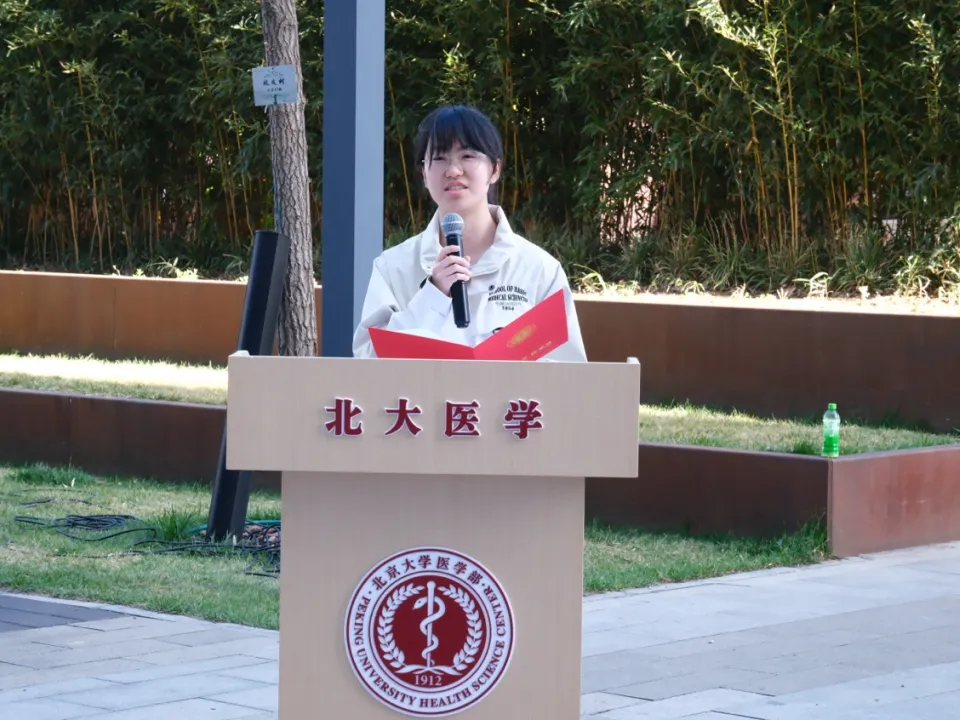 学生代表2023级临床6班罗晗熙回忆了自己在基础医学院的两年求学时光。从初入学院的紧张懵懂到实验室里探索疾病机理,从无言良师的生命教育到“撷英杯”上绽放风采,她和同学们一路不断收获、不断成长,立志成为有温度,有担当,有作为的北大医学人。