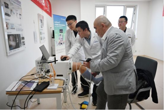 4月20日,代表团前往北京大学第三医院崇礼院区参观交流。崇礼院区作为国家区域医疗中心(运动创伤)建设单位,是北京大学第三医院推动优质医疗资源扩容下沉的重要窗口。代表团实地参观了冰雪运动医学中心、康复治疗区,现场观摩冲击波治疗、步态分析等临床实操演示,详细了解冬奥医疗保障经典案例及骨科精准诊疗技术的应用。随后,运动医学科团队为两国专家展示“数康师”设备。代表团专家对崇礼院区完善的学科布局与先进的康复设备给予高度评价,并就骨科创伤、脊柱外科、关节外科等领域的临床技术难点展开深入交流。