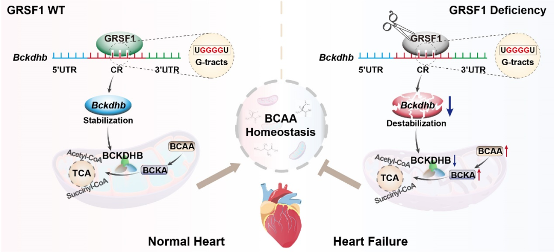 在动物模型和细胞实验中,研究证实,当心肌细胞内GRSF1缺失时,BckdhbmRNA稳定性急剧降低,导致BCKDHB蛋白表达下调,BCAA及其毒性中间代谢产物BCKA发生异常蓄积,最终影响自发性心衰的发生发展。该发现明确了“GRSF1-BCKDHB-BCAA代谢轴”在心力衰竭发生发展中的重要作用。